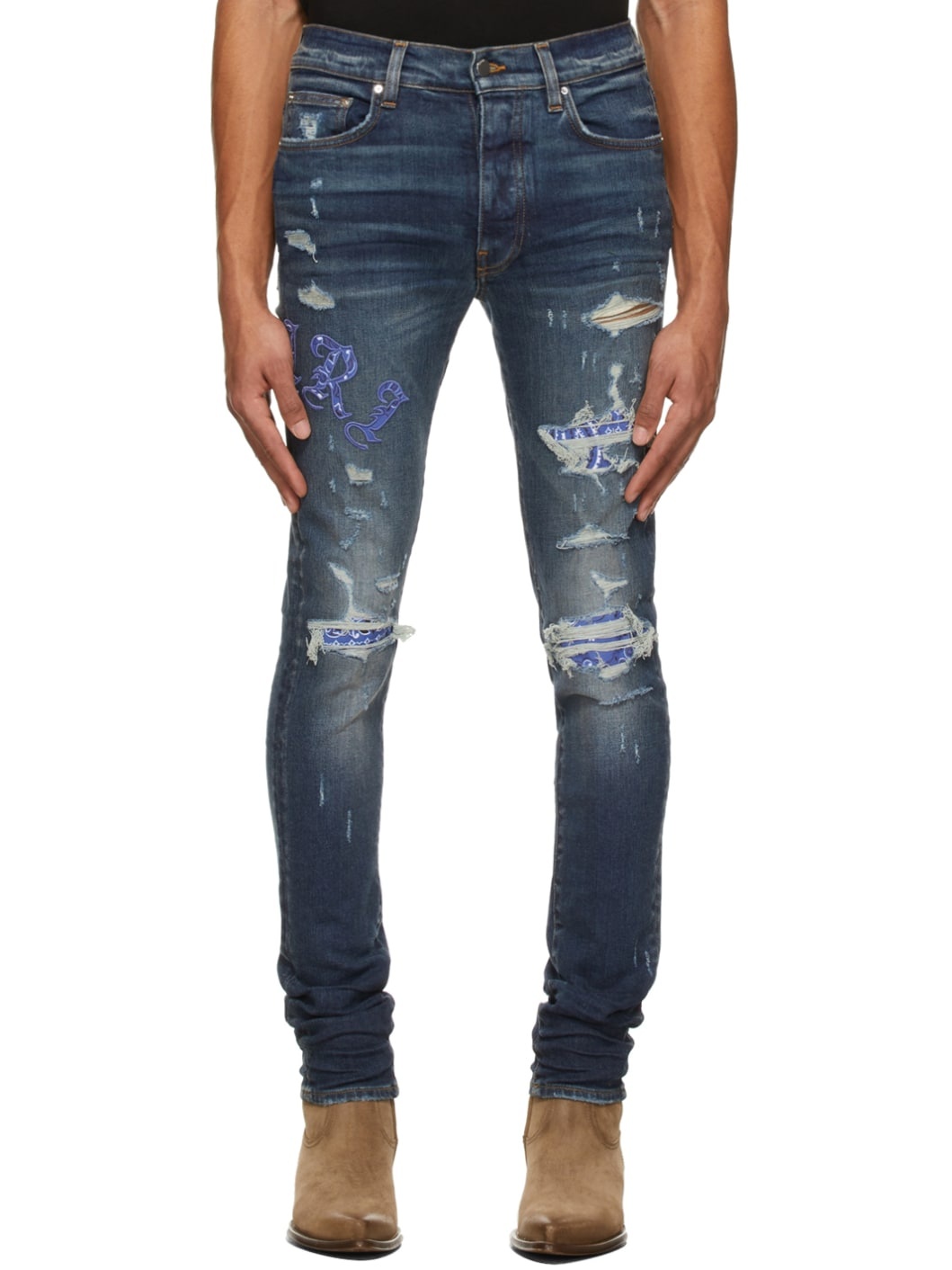 Skinny-fit stretch denim jeans in indigo featuring fading, whiskering, and distressing. Graphic detailing featuring paisley pattern in blue, black, and white throughout. · Mid-rise · Five-pocket styling · Belt loops at waistband · Logo appliqué in blue at leg · Buffed leather logo patch at back waistband · Button-fly · Logo-engraved silver-tone hardware Supplier color: Deep classic 92% cotton, 6% elastomultiester, 2% elastane.