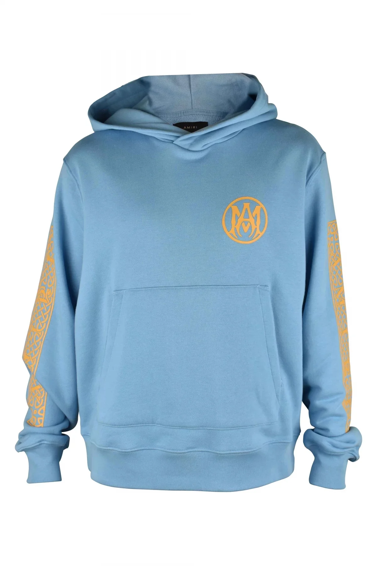 Amiri hooded sweatshirt in blue cotton. Orange “MA” logo print on chest. Orange Ouija prints on back. Printed sleeves. Kangaroo pocket. Ribbed edges. Made in Italy.