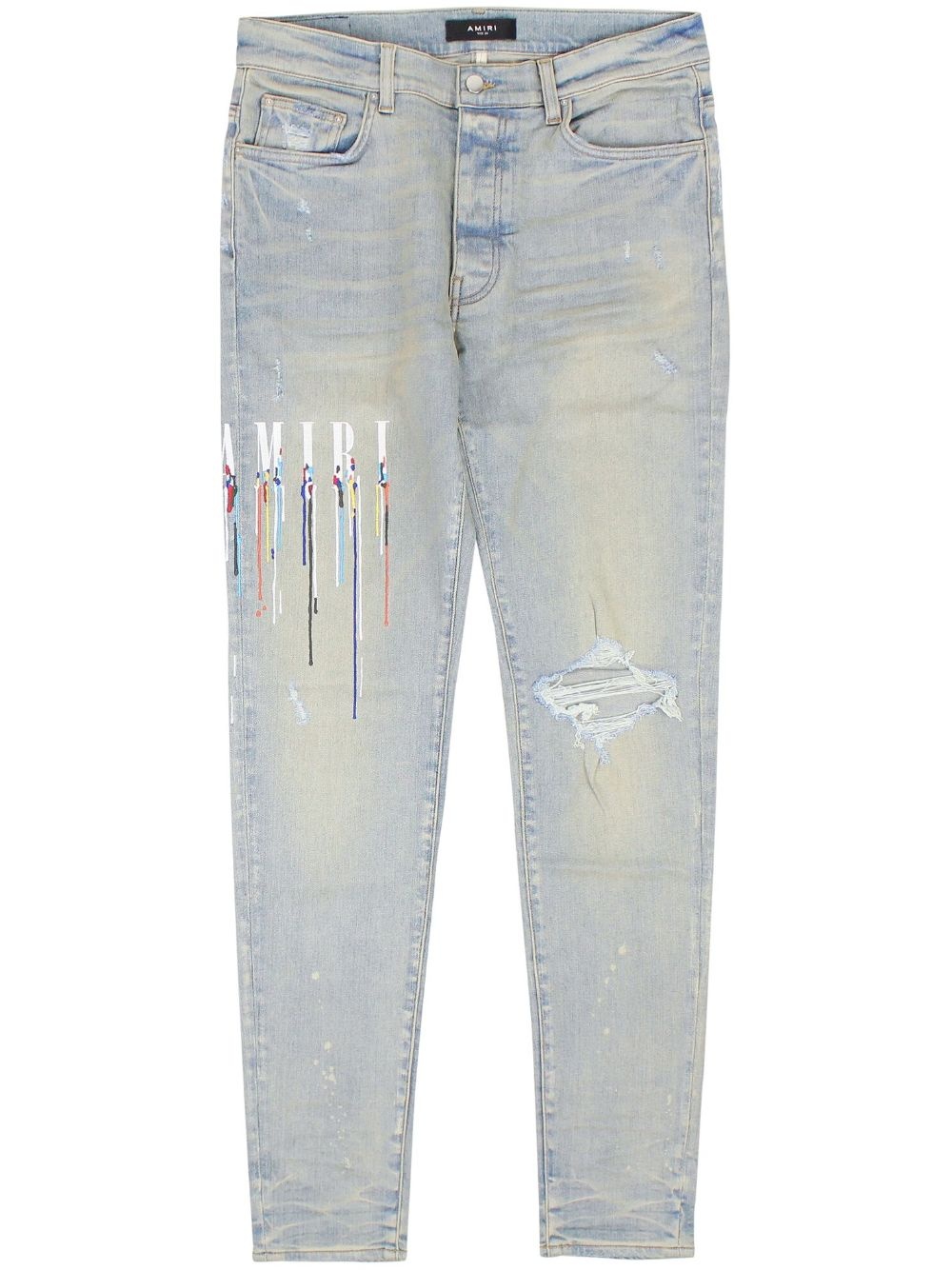 paint drip logo straight-fit jeans Highlights - Light blue - Stretch-cotton - Washed denim - Logo print to the front - Appliquã© logo - Ripped detailing - Belt loops - Front button fastening - Classic five pockets - Straight leg Imported Composition Cotton 100%