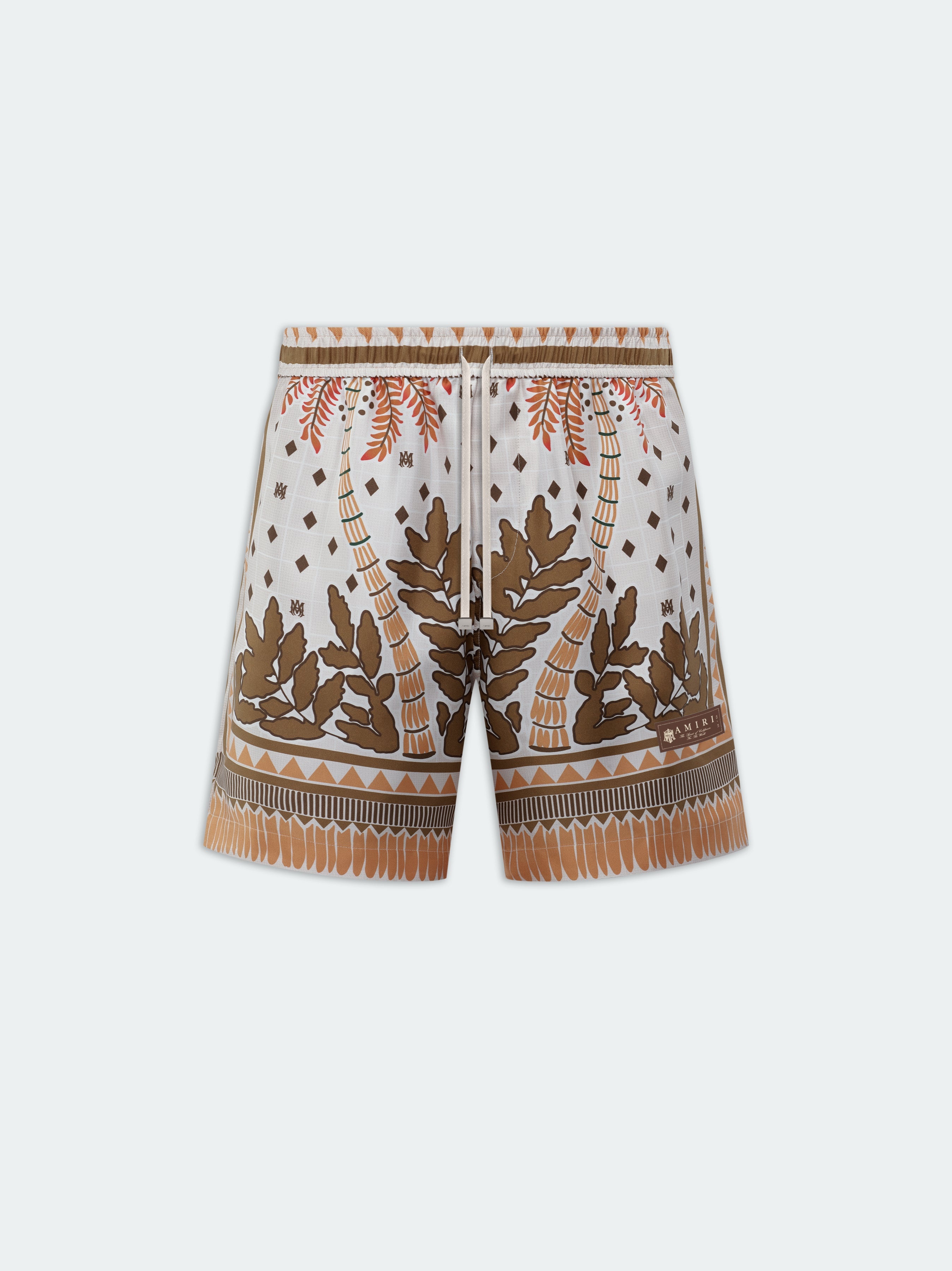 ARTFULLY COMPOSED, THESE SHORTS ARE ADORNED WITH SUN-SOAKED PALMS AMID ORGANIC MOTIFS AND GEOMETRIC PATTERNING. CUT IN FLUID SILK, FINISHING ELEMENTS OF THESE SHORTS INCLUDE SIDE SEAM POCKETS AND AN ELASTIC WAIST WITH DRAWCORD FOR EASE IN WEAR. THESE SHORTS OFFER AN EFFORTLESS COMPLEMENT TO THE PALM TREE BOWLING SHIRT. SPRING-SUMMER 2024 COLLECTION MADE IN ITALY 100% SILK TWILL DRY CLEAN