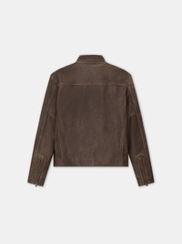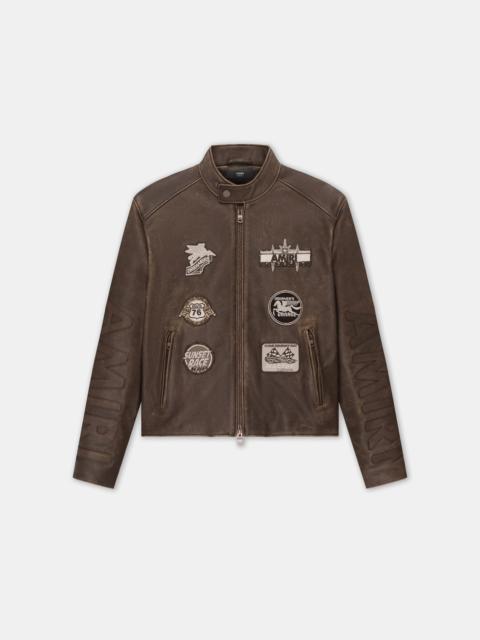 FOR PRE-FALL 2025, CUSTOM INSIGNIA ENRICHES OUTERWEAR SILHOUETTES IN A TRIBUTE TO LIFE ON THE ROAD. THE AMIRI PATCH RACER JACKET IS CRAFTED FROM DISTRESSED LEATHER WITH LEATHER LOGO PATCH APPLIQUES ON THE SLEEVES, WELT ZIPPER POCKETS, A SNAP BUTTON COLLAR, AND DOUBLE-ZIP CLOSURE. PRE-FALL 2025 COLLECTION MADE IN TURKEY 100% LEATHER THIS GARMENT HAS UNDERGONE A SPECIAL PROCESS WHICH RESULTS IN INTENTIONAL VARIATIONS OF SHADING AND COLOR, AND ADD TO THE PIECE'S UNIQUE CHARACTERISTICS. THIS MAY LEAD TO BLEEDING OR DYE TRANSFER. PLEASE USE CAUTION WHEN WASHING OR DRY-CLEANING THIS ITEM STYLE:AMLTJT1021-252 SIZE & FIT MODEL IS WEARING SIZE 46 MODEL MEASUREMENTS: HEIGHT: 6’2” CHEST: 35.5" WAIST: 28" HIP: 34.5" PRODUCT MEASUREMENTS (SIZE 46): CHEST: 22.5" SHOULDER: 20" LENGTH: 25" SLEEVE LENGTH: 36"