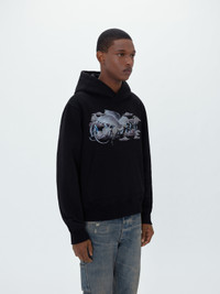 SS23 PEGASUS SCRIPT HOODIE IN BLACK MADE ITALY 14 OZ SUPIMA COTTON LOOP TERRY MODEL HEIGHT 6' 2", 28" WAIST, 34" INSEAM AND IS WEARING SIZE US: M 100% COTTON DRY CLEAN RECOMMENDED