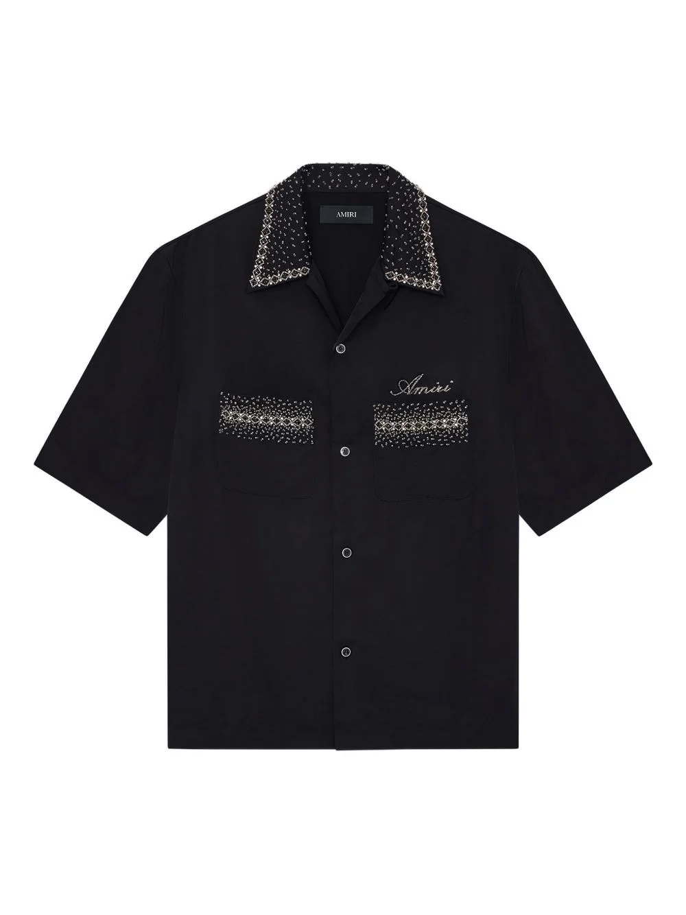 rhinestone-embellished shirt Highlights - Black - Rhinestone embellishment - Camp collar - Front button fastening - Short sleeves - Chest patch pockets Imported Composition Viscose 100% Washing instructions Read Manufacturer Guidelines