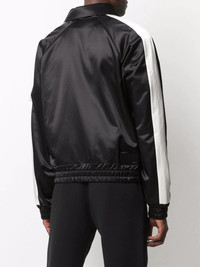 zip-up satin track jacket black/white cotton side stripe detailing embroidered logo at the chest logo patch to the rear high neck long sleeves front zip fastening two side slit pockets elasticated cuffs elasticated hem Made in Italy Composition Cotton 70%, Viscose 30% SIZE & FIT Model measurements Height 6 ft 2 in(1.88 m) Bust/Chest 36.61 in(93 cm) Hips 35.82 in(91 cm) Waist 27.95 in(71 cm) FittingInformation This piece fits true to size. We recommend you get your regular size Cut for a loose fit Made with a mid-weight non-stretch fabric Washing instructions Dry Clean Only