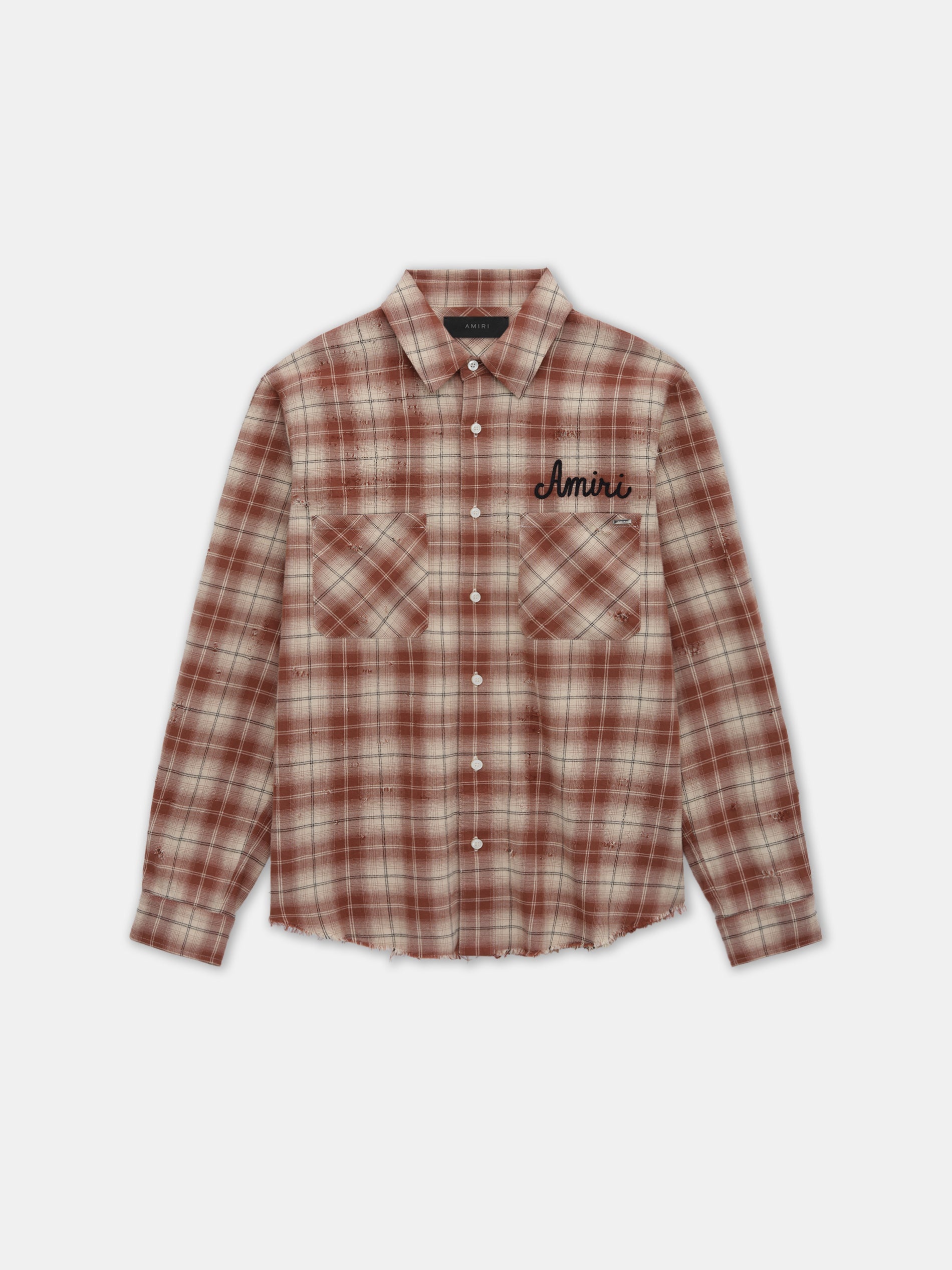 FOR PRE-SPRING 2025 MENSWEAR, CLASSIC FLANNEL SHIRTING BECOMES A CANVAS FOR INTRICATE AND NOVEL FABRICATION. THE AMIRI SHOTGUN FLANNEL IS SPECIALLY DISTRESSED IN THE HOUSE'S SIGNATURE BATTLEWORN TREATMENT AND FINISHED WITH EMBROIDERY, FRONT POCKETS, AND BUTTON-DOWN CLOSURE. PRE-SPRING 2025 COLLECTION MADE IN ITALY 100% COTTON STYLE:AMSTFL1009-234 SIZE & FIT PRODUCT MEASUREMENTS (SIZE “M”): CHEST: 46" SHOULDER: 18.5" LENGTH: 30" SLEEVE LENGTH: 36"