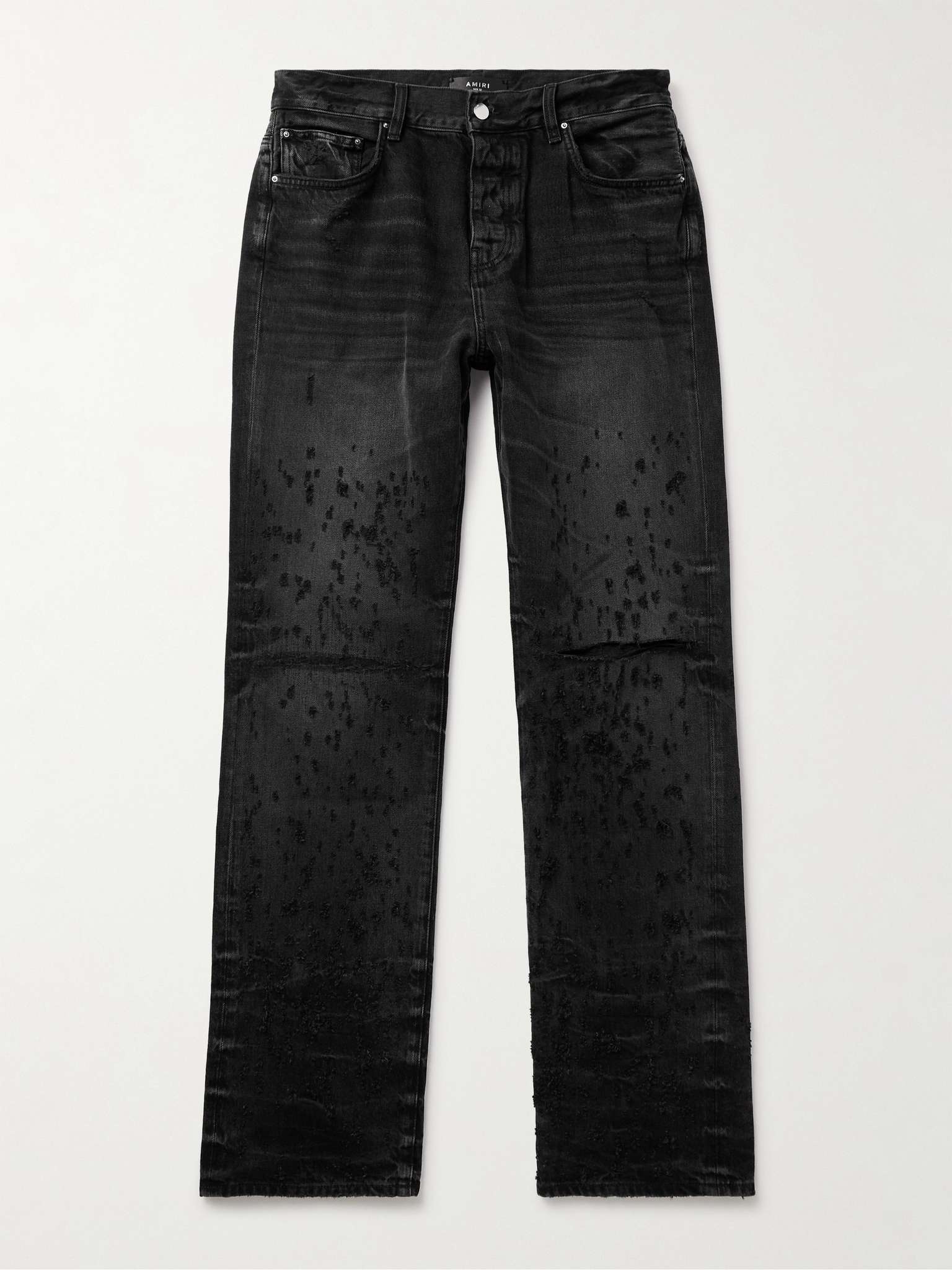 AMIRI's straight-leg jeans take distressed denim to a new level. They're faded and whiskered and then each one is shot individually to create unique, authentic tears. Size & Fit - Fits true to size. Take your normal size - Regular-straight leg, low-crotch style - Mid-weight, non-stretchy fabric - Model is shown wearing a 32 - Model measures: waist size 32, height 6'2"/ 188cm Details & Care - Black denim - Button fastenings - 100% cotton - Dry clean - Designer wash: Faded Black - This product is unique and therefore may differ from that pictured