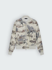 SS23 SHRUKEN BOMBER IN LIGHT TAN MADE ITALY HAND EMBRIODERED MODEL HEIGHT 6' 2", 28" WAIST, 34" INSEAM AND IS WEARING SIZE US: 46 DETAILS & CARE SILK ORGANZA W/ EMBRIODERY & EMBELLISHMENTS DRY CLEAN RECOMMENDED