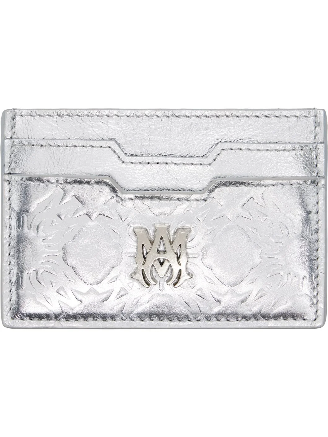 Laminated creased leather card holder. · Graphic pattern embossed at face and back face · Logo hardware at face · Logo stamp at back face · Four card slots · Central note slot · H2.75" x W4" Supplier color: Silver Leather. Made in Italy 261886M164009