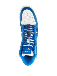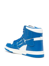 Skel-Top sneakers Using its popular 'Skel Toe' slip-on as inspiration, AMIRI presents these Skel-Top high-top sneakers. Crafted with blue and white leather panels and detailed with the signature bone-motif appliqué to the side, this panelled pair combines an on-court aesthetic with streetwear for a distinctive look. Imported Composition Outer: Leather 100% Lining: Fabric 100% Sole: Rubber 100% SIZE & FIT Measurement HEEL 1.18 in(3 cm) HEIGHT 4.33 in(11 cm) Sole height 0.78 in(2 cm)