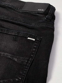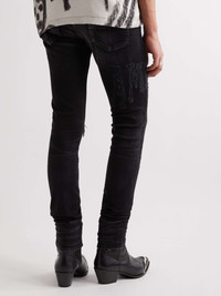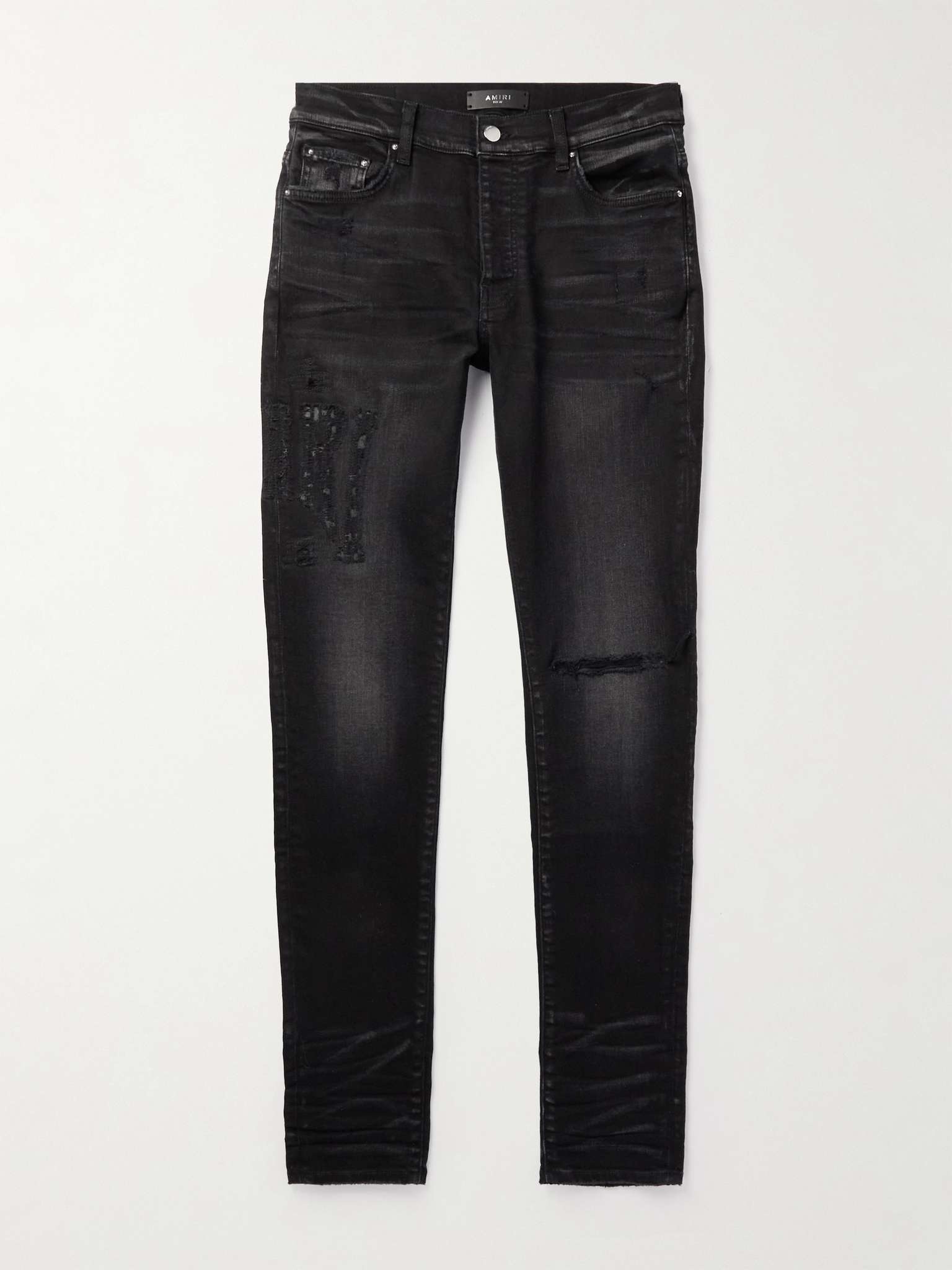 AMIRI's skinny-fit stretch-denim jeans are distressed to spell out the brand's name. Pair them with cowboy boots for a rock 'n' roll-inspired outfit. Size & Fit - Fits true to size. Take your normal size - Skinny leg, mid-rise style - Mid-weight, slightly stretchy fabric - Model is shown wearing a 30 - Model measures: waist size 30, height 6'2"/ 188cm Details & Care - Black stretch-denim - Button fastenings - 92% cotton, 6% elastomultiester, 2% elastane - Dry clean