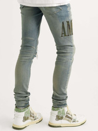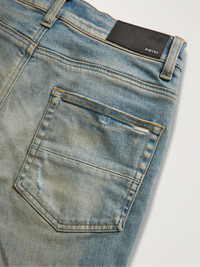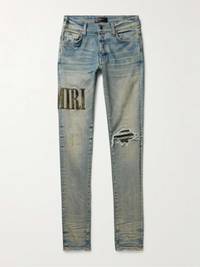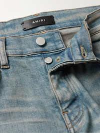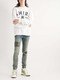 AMIRI's jeans have a deconstructed feel that highlights the label's affinity for arts and rock 'n' roll culture. They're cut for a skinny fit from faded blue denim that's detailed with a leather stencil-logo appliqué and tasteful distressing. Small to size. See Size & Fit notes. Size & Fit - Fits small to size. Take one size larger than normal - Skinny leg, low-rise style - Mid-weight, stretchy fabric - Model wears a 30 - Model measures: waist size 29, height 6'2"/ 188cm Details & Care - Blue denim, tonal-green leather - Button fastenings - 92% cotton, 6% polyester, 2% elastane; trim: 100% leather (Cow) - Designer wash: Clay Indigo