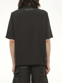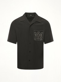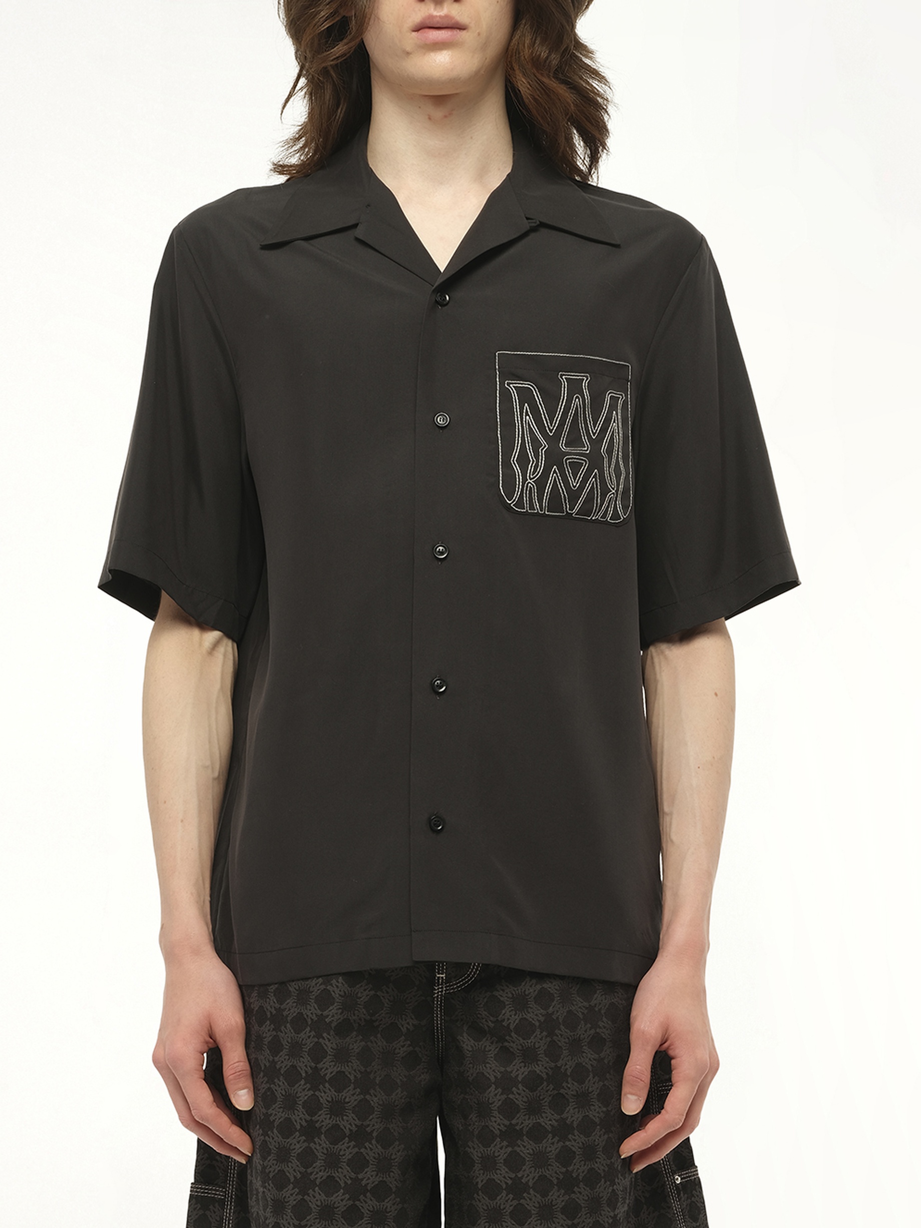 AMIRI's MA Outline Bowling Shirt in Black is a stylish and contemporary piece that effortlessly combines classic design with modern flair. Perfect for any occasion, this shirt is a must-have addition to your wardrobe. - Composition: 60% Modal 40% Polyester - Relaxed fit for comfort and style - Distinctive outline logo detailing - Button-up front closure - Short sleeves for a casual look - Versatile black colour Model is 187 cm and wears size M SKU: AMSTCA1151 001