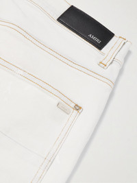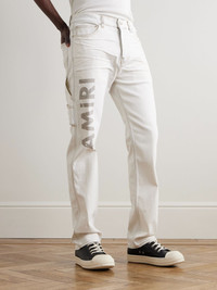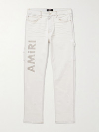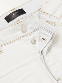 AMIRI's bleached denim jeans are stamped with the brand's name on one leg and subtly splattered with tonal paint. Hammer loops and heavy whiskering round out their rugged feel. Small to size. See Size & Fit notes. Size & Fit - Fits small to size. Take one size larger than normal - Slim-straight leg, mid-rise style - Mid-weight, non-stretchy fabric - Model is shown wearing a 34 - Model measures: waist size 30, height 6'2"/ 188cm Details & Care - White and grey denim - Button fastenings - 92% cotton, 6% elastomultiester, 2% elastane - Spot clean