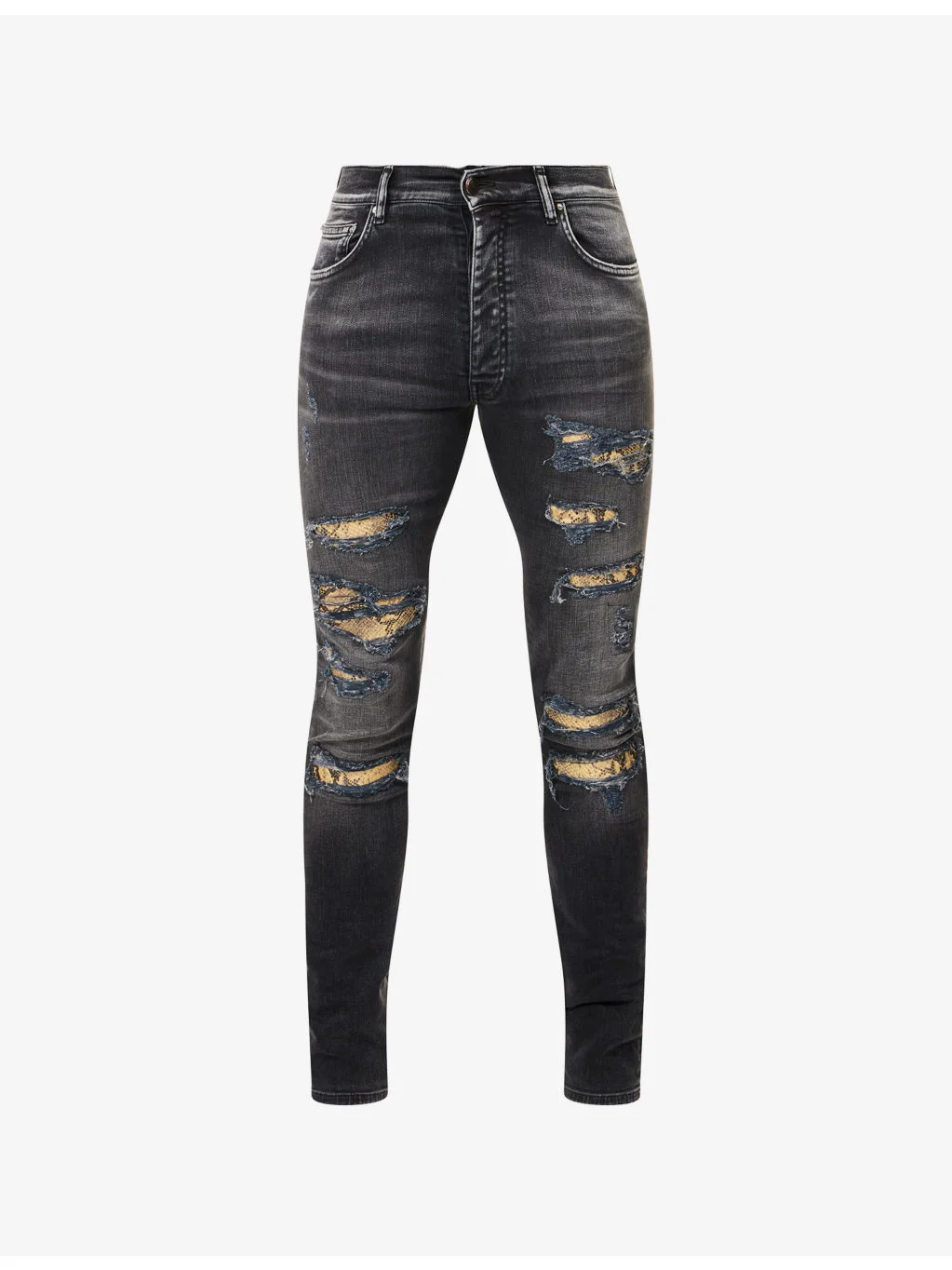 PRODUCT DETAILS - Amiri denim jeans - 92% cotton, 6% elastomultiester, 2% elastane; trims 100% leather - Button and button-fly fastening - Skinny fit, mid-rise, belt loops, five pockets, distressed denim rips and leather snake-print patches at front, brand patch and emblem at back - Hand wash - Made in Italy - Size UK 30: rise 10in / 25.5cm, inside leg 34in / 86cm, leg opening 12in / 30.5cm - Model is 6ft 2in/1.88m and wears a size UK 30 - Midweight, slight stretch Ref: R04569203