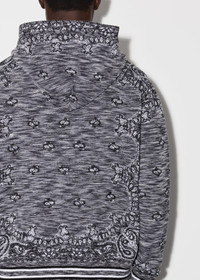 SPACE DYE BANDANA HOODIE IN BLACK MADE IN ITALY CASHMERE COTTON MODEL HEIGHT 6' 2", 28" WAIST, 34" INSEAM AND IS WEARING SIZE US MEDIUM DETAILS & CARE 100% ORGANIC COTTON W/ 85% COTTON, 15% CASHMERE DRY CLEAN RECOMMENDED