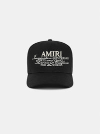 PRE-FALL 2025 ACCESSORIES HONOR THE CREATIVE SPIRIT OF CALIFORNIA AND AMIRI'S ROOTS IN ARTISANAL CRAFT. THE AMIRI SPIRIT HAT IS EMBROIDERED WITH A TRIBUTE TO DREAMERS AND FINISHED WITH A CURVED BRIM, EMBROIDERED EYELETS, AND DOUBLE SNAPBACK FASTENING. PRE-FALL 2025 COLLECTION MADE IN USA COTTON, POLYESTER EACH PIECE IS METICULOUSLY CRAFTED AND INHERENTLY UNIQUE. SLIGHT VARIATIONS IN THE ARTWORK ARE A NATURAL RESULT OF THE PRINTING PROCESS AND CONTRIBUTE TO THE DISTINCTIVE CHARACTER OF THIS PRODUCT. STYLE:AMHACP1062-001 SIZE & FIT PRODUCT MEASUREMENTS: CROWN CIRCUMFERENCE: 22.875" CROWN HEIGHT: 3.75" VISOR WIDTH: 2.75" PLEASE CONTACT FOR ADDITIONAL INFORMATION.