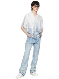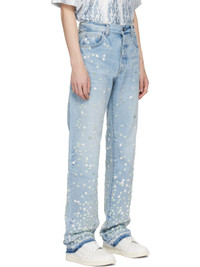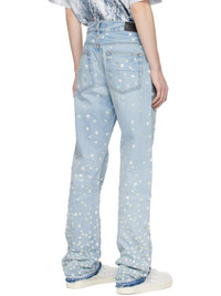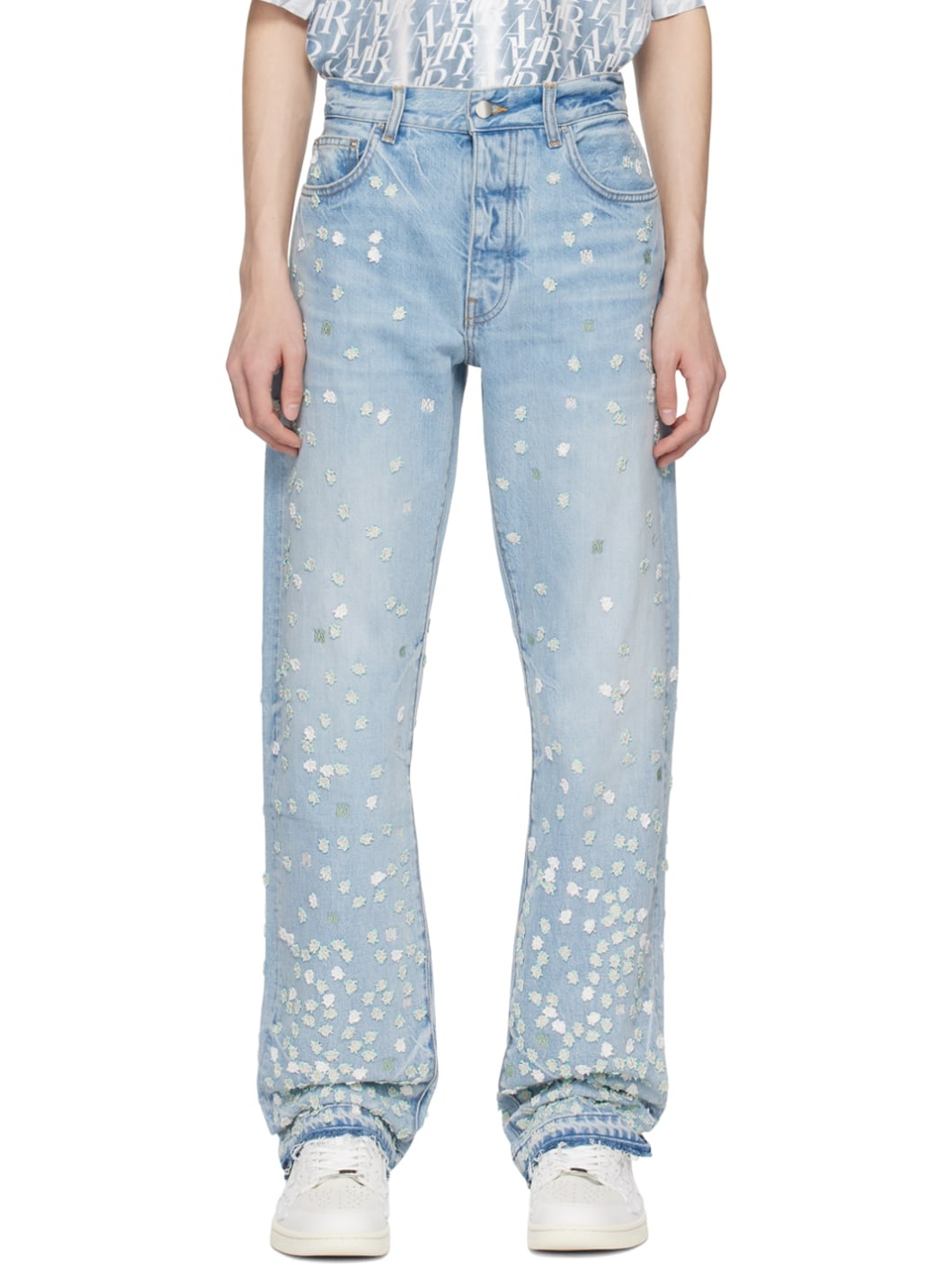 Straight-leg non-stretch denim jeans. Fading, whiskering, and embroidered floral and logo pattern throughout. · Belt loops · Five-pocket styling · Button-fly · Leather logo patch at back waistband · Logo hardware at back pocket · Logo-engraved silver-tone hardware · Contrast stitching in yellow Supplier color: Perfect indigo 100% cotton. Made in United States 241886M186073