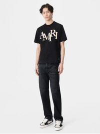 HOUSE SIGNATURE GRAPHICS ARE REIMAGINED IN NOVEL APPLICATIONS FOR PRE-FALL 2024 MENSWEAR. THE COTTON AMIRI STAGGERED TEE IS ILLUSTRATED WITH THE STAGGERED LOGO IN BOLD CONTRAST. PRE-FALL 2024 COLLECTION MADE IN ITALY 100% COTTON