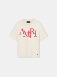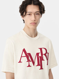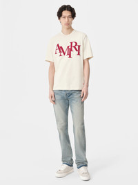 HOUSE SIGNATURE GRAPHICS ARE REIMAGINED IN NOVEL APPLICATIONS FOR PRE-FALL 2024 MENSWEAR. THE COTTON AMIRI STAGGERED TEE IS ILLUSTRATED WITH THE STAGGERED LOGO IN BOLD CONTRAST. PRE-FALL 2024 COLLECTION MADE IN ITALY 100% COTTON