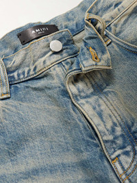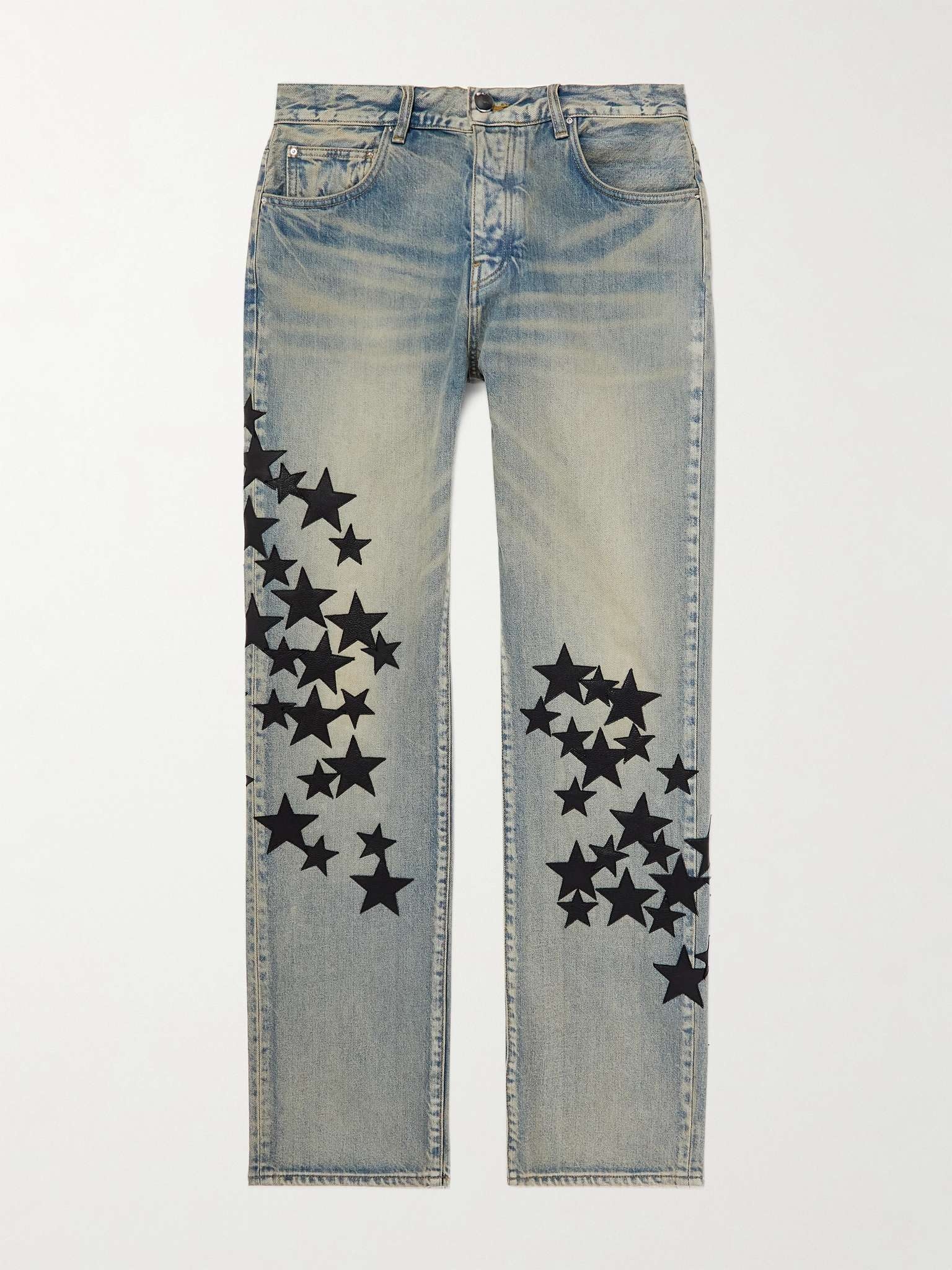 Rock 'n' roll stars Axl Rose and Steven Tyler were some of Mike Amiri's first clients. Channelling that same frontline energy, these straight-leg jeans are cut from 14oz. Italian denim and appliquéd with a cascade of leather stars. Wear them with the label's high-top sneakers. Size & Fit - Model wears a size larger to achieve a looser fit - Regular-straight leg, mid-rise style - Mid-weight, slightly stretchy fabric - Model is shown wearing a 32 - Model measures: waist size 29, height 6'1"/ 185cm Details & Care - Light-blue denim, black leather - Button fastenings - 100% cotton; trim: 100% leather - Dry clean - Designer wash: Clay Indigo