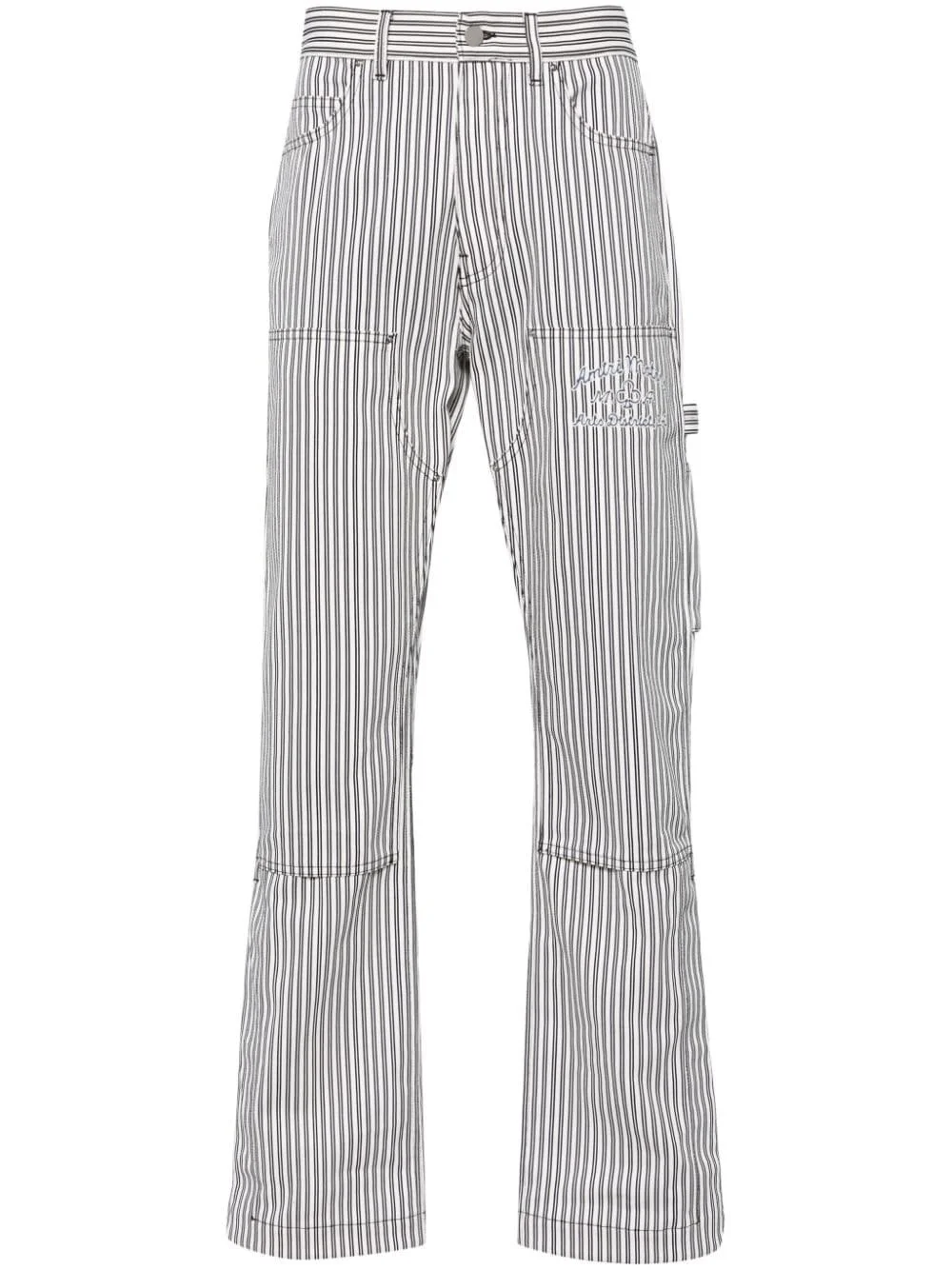 striped cotton carpenter trousers Boasting an utilitarian-inspired carpenter silhouette, these AMIRI trousers are emblazoned with a classic striped pattern. The brand's embroidered logo offers a signature finishing touch. Highlights - White/black/blue - Cotton - Vertical stripe pattern - Panelled design - Embroidered logo to the front - Button fly fastening - Logo-debossed buttons - Belt loops - Classic five pockets - Two side patch pockets - Straight leg Made in Italy Composition Cotton 100% SIZE & FIT Model measurements Height 6 ft 2 in(1.89 m) Bust/Chest 37.79 in(96 cm) Hips 37 in(94 cm) Waist 29.92 in(76 cm) FittingInformation Designed for a straight-leg, allowing for an unrestricted and comfortable fit over the leg The adjustable tabs allow for fitted preferences Made from a midweight non-stretch fabric This piece fits true to size – take your usual size Washing instructions Dry Clean Only
