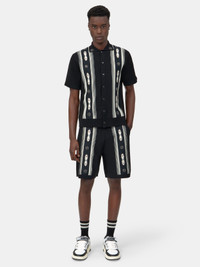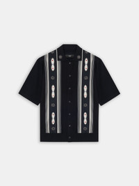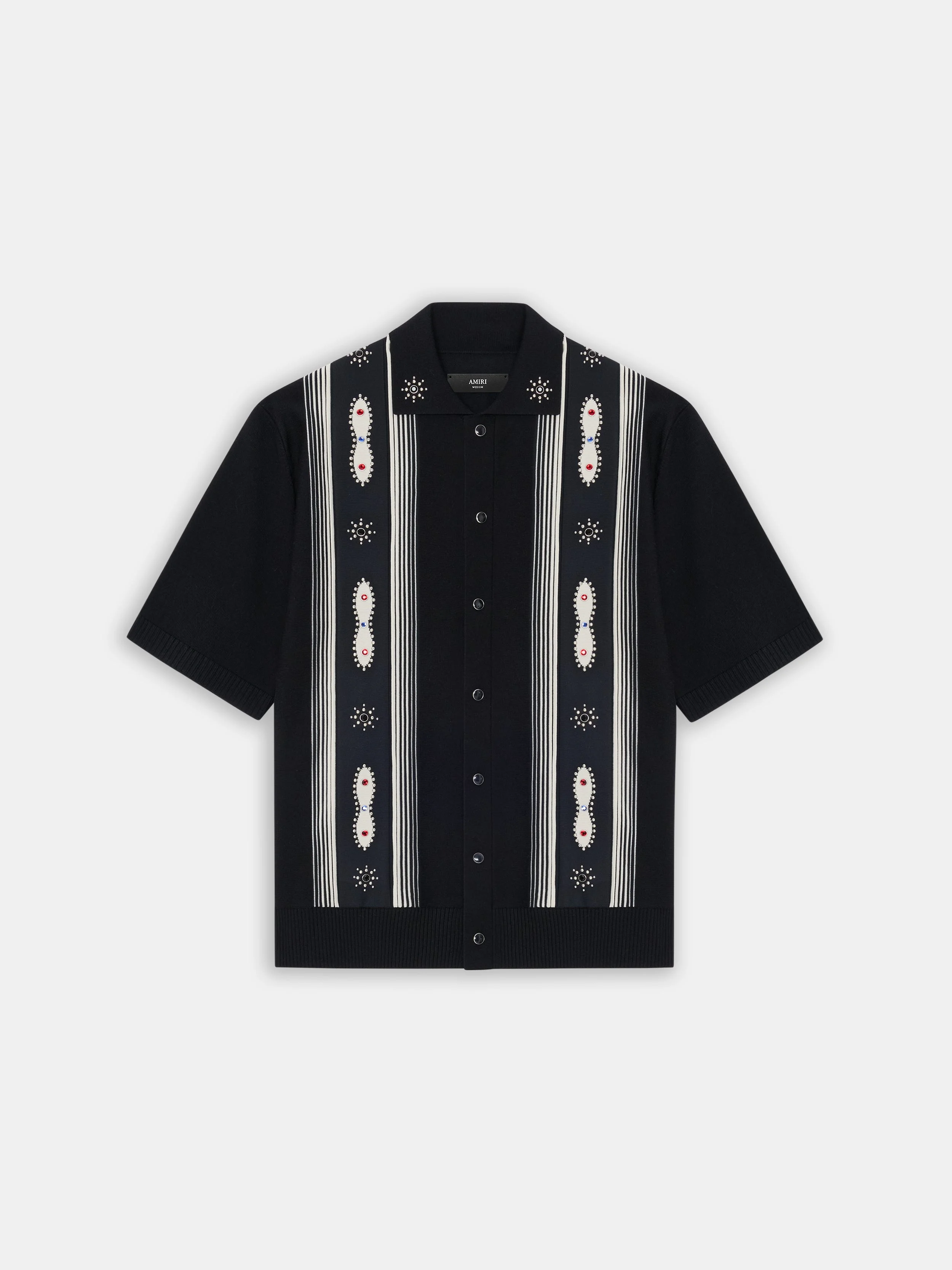 STUD EMBELLISHMENTS AND RHINESTONE RIVETS IMBUE HOUSE SIGNATURE SILHOUETTES WITH A RENEGADE SPIRIT FOR PRE-SPRING 2026. THE STUD STRIPE SHIRT IN VIRGIN WOOL IS CRAFTED WITH FINE RIB FINISHES AND SNAP BUTTON CLOSURE. PRE-SPRING 2026 COLLECTION MADE IN ITALY 90% VIRGIN WOOL, 10% POLYESTER THIS GARMENT HAS UNDERGONE A SPECIAL PROCESS WHICH RESULTS IN INTENTIONAL VARIATIONS OF SHADING AND COLOR, AND ADD TO THE PIECE'S UNIQUE CHARACTERISTICS. THIS MAY LEAD TO BLEEDING OR DYE TRANSFER. PLEASE USE CAUTION WHEN WASHING OR DRY-CLEANING THIS ITEM STYLE:AMTOKN1011-001 SIZE & FIT MODEL MEASUREMENTS: HEIGHT: 6’2” CHEST: 35.5" WAIST: 28" HIP: 34.5"