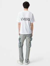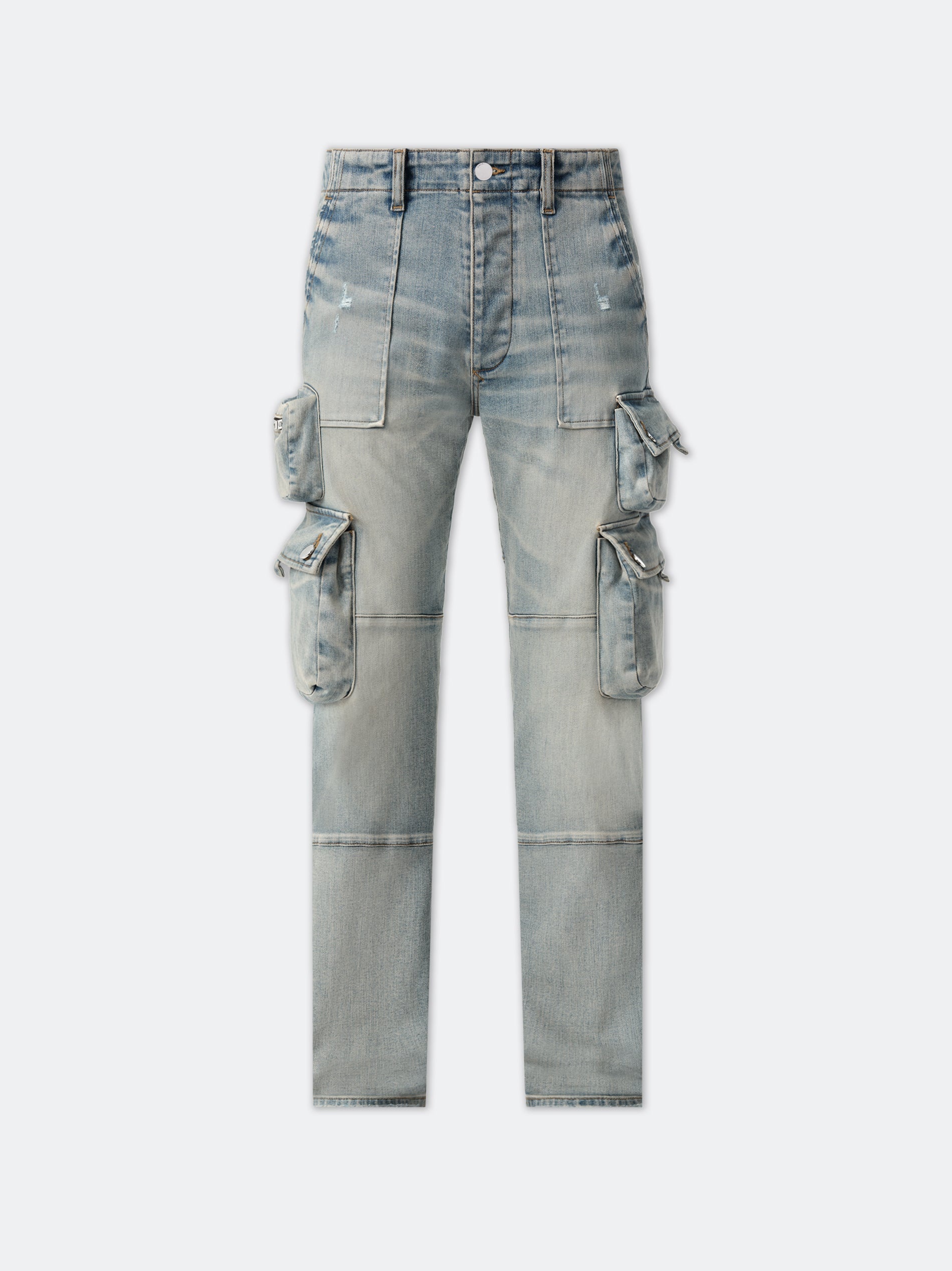 HOUSE DENIM SILHOUETTES ARTICULATE UTILITARIAN TROPES FROM THE WORLD OF WORKWEAR. THE TACTICAL CARGOS ARE DESIGNED IN A SLIM STRAIGHT FIT WITH CARGO POCKETS, BUTTON FLY CLOSURE AND HAND-DISTRESSED FINISHING. CORE COLLECTION MADE IN USA 92% COTTON, 6% ELASTOMULTIESTERE, 2% ELASTANE