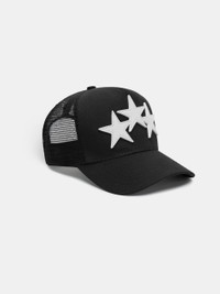 HOUSE SIGNATURE GRAPHICS ILLUSTRATE ACCESSORIES ROOTED IN WEST COAST SAVOIR-FAIRE. THE CANVAS AND MESH 3 STAR TRUCKER HAT FEATURES LEATHER STAR APPLIQUES AND IS FINISHED WITH A CURVED BRIM, EMBROIDERED EYELETS AND DOUBLE SNAPBACK FASTENING. CORE COLLECTION MADE IN USA SHELL: 100% COTTON, LINING: 100% LYOCELL, MESH: 100% POLYESTER EACH PIECE IS METICULOUSLY CRAFTED AND INHERENTLY UNIQUE. SLIGHT VARIATIONS IN THE ARTWORK ARE A NATURAL RESULT OF THE PRINTING PROCESS AND CONTRIBUTE TO THE DISTINCTIVE CHARACTER OF THIS PRODUCT. STYLE:XMAH002-004 SIZE & FIT MEASUREMENTS ARE BASED ON LEAVING 2 SPANS OPEN CROWN CIRCUMFERENCE: 22.875” CROWN HEIGHT: 3.75” VISOR WIDTH: 2.75” PLEASE CONTACT FOR ADDITIONAL INFORMATION.