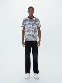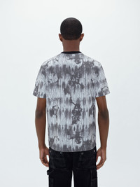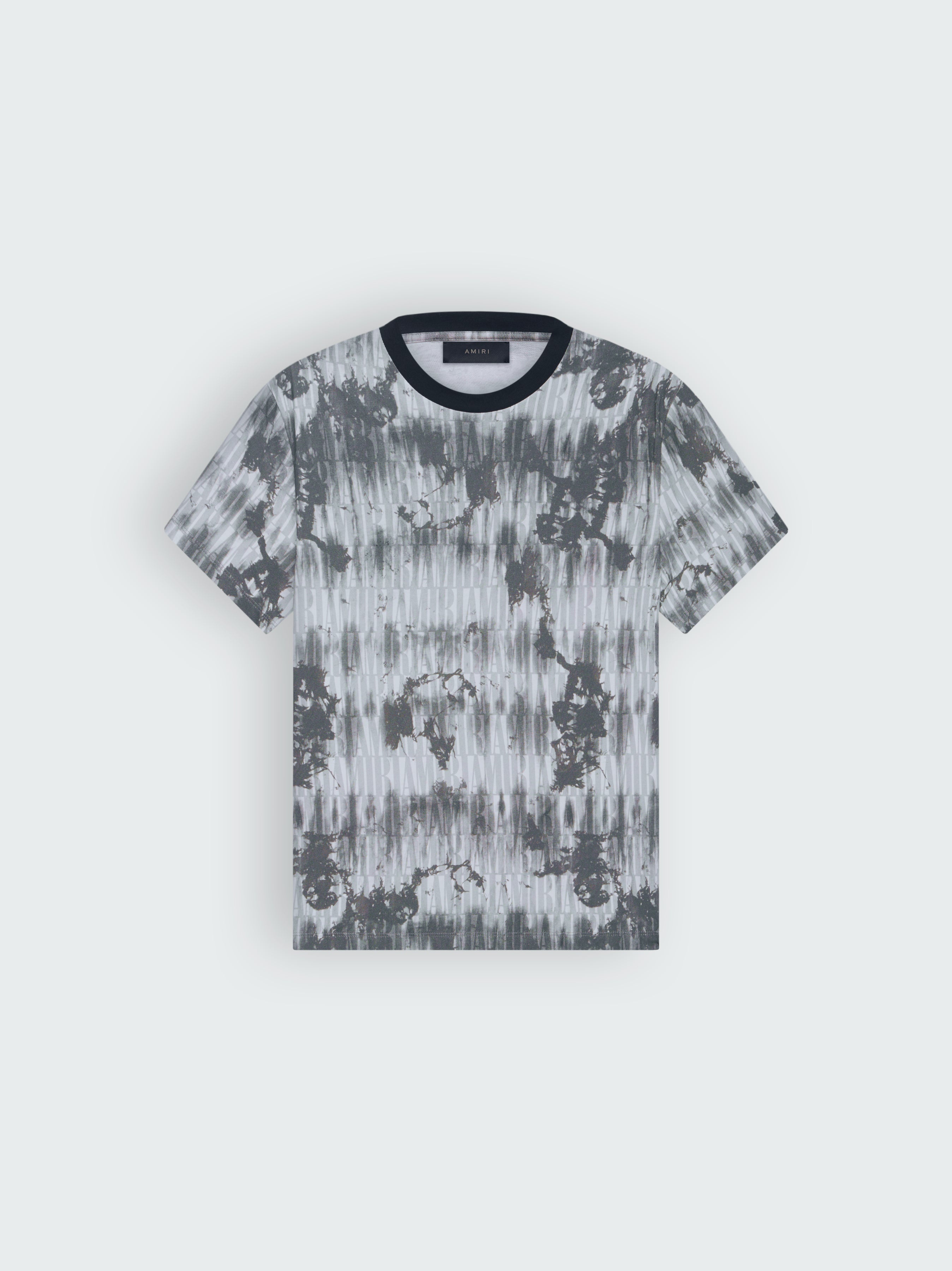SS23 AMIRI TIE DYE TEE IN GREY MADE ITALY 30 SINGLE SUPIMA COTTON JERSEY MODEL HEIGHT 6' 2", 28" WAIST, 34" INSEAM AND IS WEARING SIZE US: M 100% COTTON DRY CLEAN RECOMMENDED