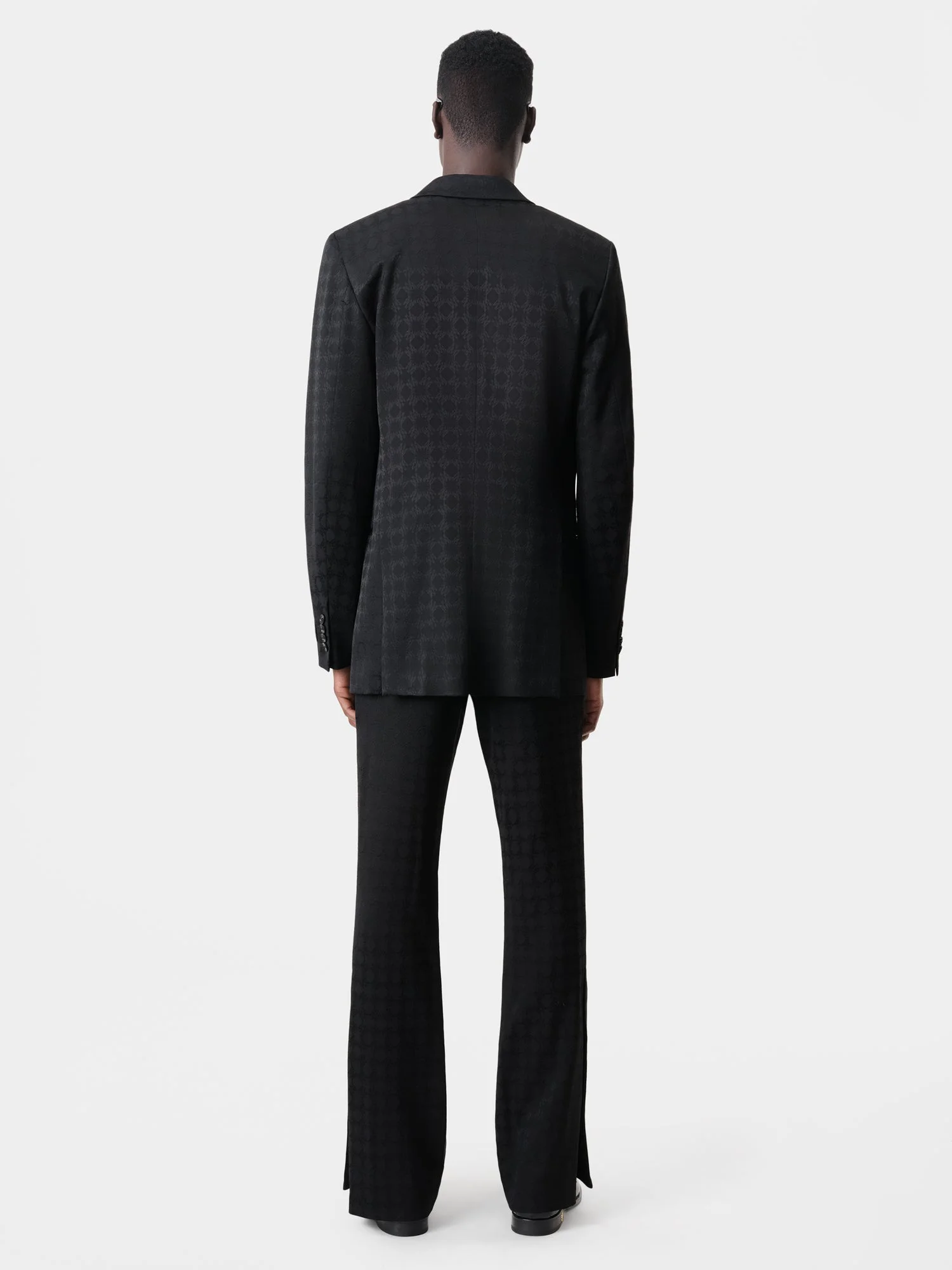 FOR AUTUMN-WINTER 2024, CUSTOM-WOVEN MA QUAD MONOGRAM PRINT ENHANCES TIMELESS SILHOUETTES INSPIRED BY AMERICA'S MID-CENTURY. THE TONAL MA QUAD KICK FLARE IS DESIGNED IN THE HOUSE'S SIGNATURE FLARE SILHOUETTE WITH SIDE SEAM POCKETS, CONCEALED HOOK-AND-ZIP CLOSURE, AND BUTTONS AT THE ANKLE FOR A CUSTOMIZABLE FIT THAT CAN ACCOMMODATE VARIOUS SHOE STYLES. AUTUMN-WINTER 2024 COLLECTION MADE IN ITALY 79% VISCOSE, 20% WOOL, 1% ELASTANE