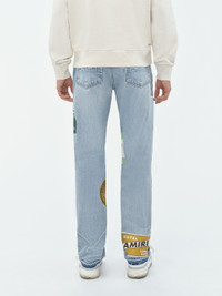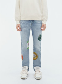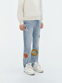 REFERENCING THE GOLDEN AGE OF TRAVEL IN AMERICA'S MID-CENTURY, THESE JEANS ARE ADORNED WITH APPLIQUÉD PATCHES INSPIRED BY VINTAGE LUGGAGE STICKERS. THESE JEANS ARE CRAFTED IN THE CLASSIC FIVE-POCKET STYLE AND ARE SPECIALLY WASHED AND TREATED FOR A PERFECTLY WORN-IN EFFECT. STATEMENT-MAKING YET WEARABLE, THESE JEANS ARE A FUTURE HEIRLOOM OF THOUGHTFUL ARTISTRY AND ENDURING CONSTRUCTION. SPRING-SUMMER 2024 COLLECTION MADE IN USA 100% COTTON DRY CLEAN