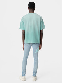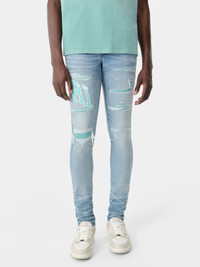 FOR PRE-FALL 2024 MENSWEAR, DENIM BECOMES A CANVAS FOR INTRICATE AND NOVEL FABRICATION PROCESSES. THE VARSITY LOGO REPAIR JEAN IS DESIGNED IN HAND-DISTRESSED SKINNY-FIT STRETCH DENIM AND ADORNED WITH PATCH APPLIQUÉ OF THE SEASON'S VARSITY LOGO. PRE-FALL 2024 COLLECTION MADE IN USA 92% COTTON, 6% ELASTOMULTIESTER, 2% ELASTANE
