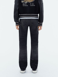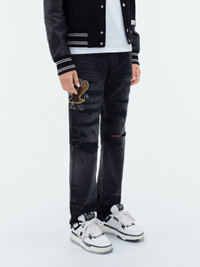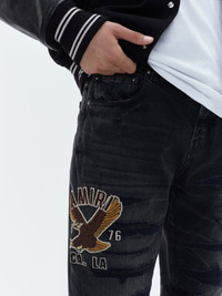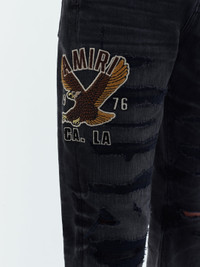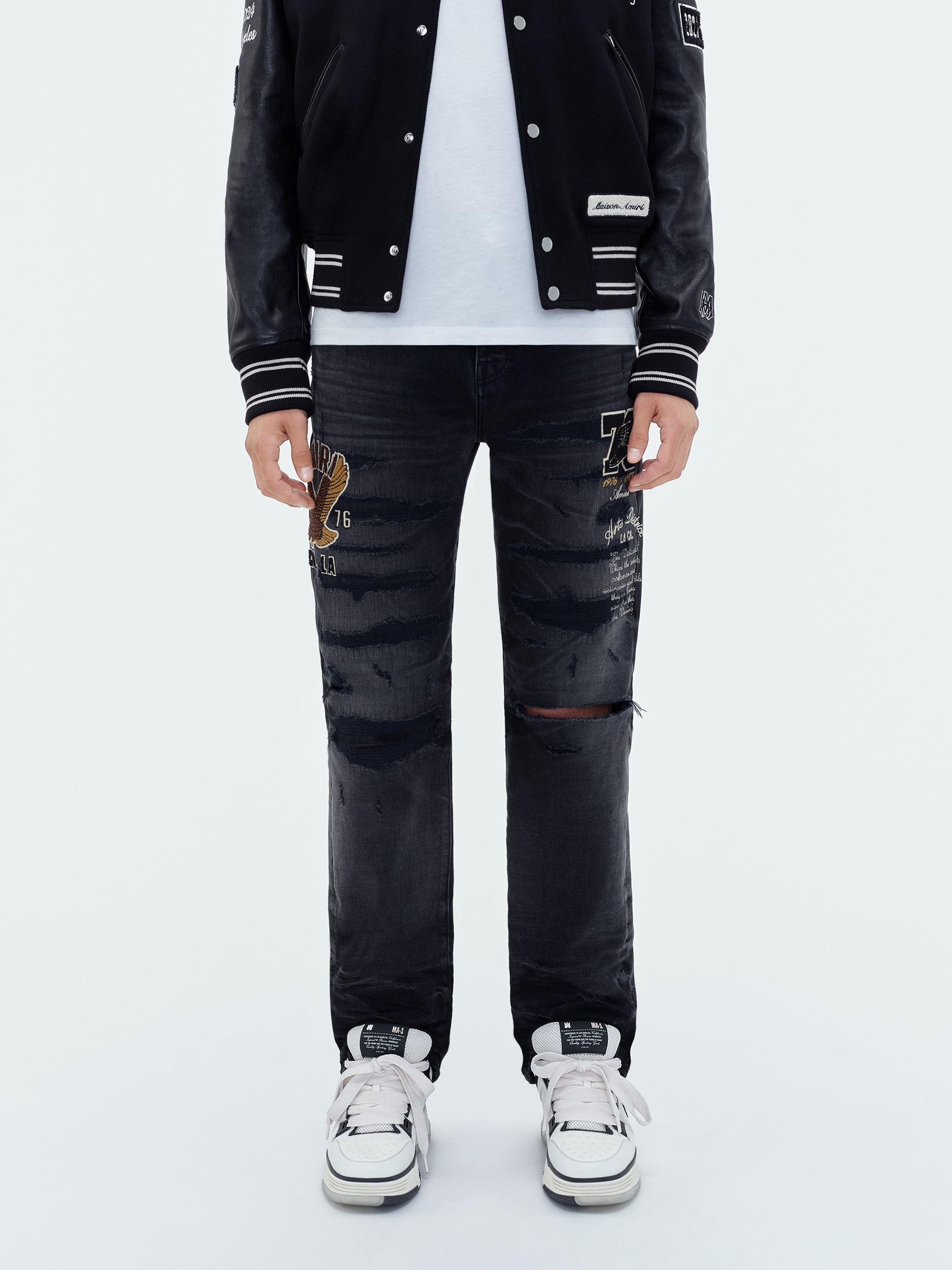 THESE JEANS IN ITALIAN DENIM TRANSPOSE A COLLEGIATE VISUAL LANGUAGE ONTO THE HOUSE'S ICONIC STRAIGHT SILHOUETTE. THE AMIRI LOGO APPEARS IN TIME-HONORED VARSITY CHENILLE LETTERING ALONGSIDE AN EAGLE IN FLIGHT, WHILE EMBROIDERY COMMEMORATES THE HOUSE'S ARTS DISTRICT ORIGINS. ARTFULLY HAND-ABRADED AND REPAIRED FOR TIME-WORN APPEAL, THIS HEIRLOOM PIECE IS FINISHED WITH AN EMBROIDERED TRIBUTE TO "THE DEDICATED" — THOSE WHO MOVE EVER-FORWARD, SETTLING FOR NOTHING LESS THAN GREATNESS. PRE-SPRING 2024 COLLECTION MADE IN USA 100% COTTON DRY CLEAN ONLY