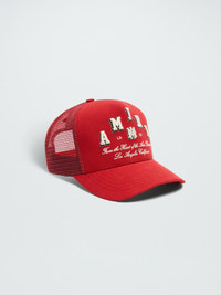 THIS TRUCKER HAT PAYS HOMAGE TO THE HOUSE'S LA ARTS DISTRICT ORIGINS THROUGH A DISTINCTIVELY COLLEGIATE VISUAL LANGUAGE. THE AMIRI LOGO APPEARS IN EMBROIDERED VARSITY LETTERING ALONGSIDE THE MA ICON ON THIS HAT, WHOSE FINISHING DETAILS INCLUDE CURVED BRIM, EMBROIDERED EYELETS AND DOUBLE SNAPBACK FASTENING. 100% COTTON, 100% MESH, LINING: 100% TENCEL DRY CLEAN ONLY