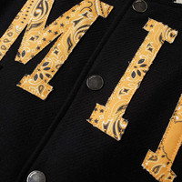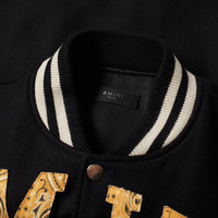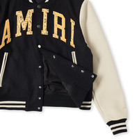 Old school Americana makes up a large part of AMIRI’s design influences, and this varsity jacket draws inspiration from the native’s collegiate classics. Infused with vintage flair, this black rendition is crafted in Italy from a wool rich blend, then refined by way of supple leather sleeves. Framed with style-synonymous striped knits, it’s completed with a bandana print filled logo for a signature hit of rock ‘n’ roll cool. - 75% Wool, 25% Nylon - Leather Details - Press Stud Closure - 2 Side Pockets - Appliqué Branding - Ribbed Trims - Made in Italy