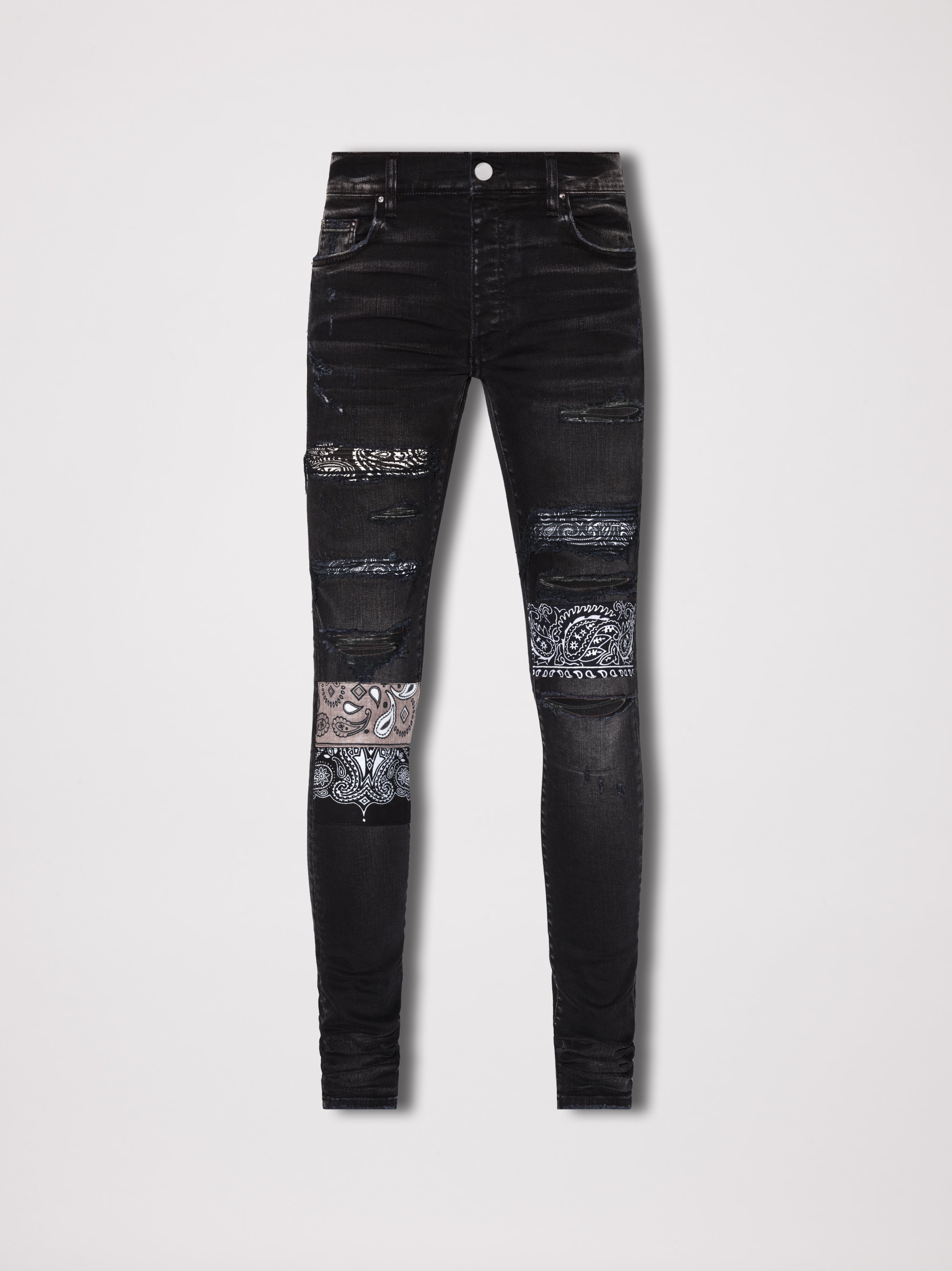 DISTRESSED ITALIAN DENIM SKINNY JEANS ABRASIONS AND DISTRESSING THROUGHOUT VINTAGE BANDANA PATCHES THROUGHOUT CLASSIC AMIRI 5 POCKET JEAN MADE IN LOS ANGELES, CALIFORNIA CLASSIC SKINNY LEG FIT MODEL WEARS A SIZE 29 WE RECOMMEND SIZING UP FOR A LOOSER FIT DETAILS & CARE BUTTON FLY ITALIAN STRETCH DENIM DRY CLEAN RECOMMENDED