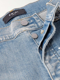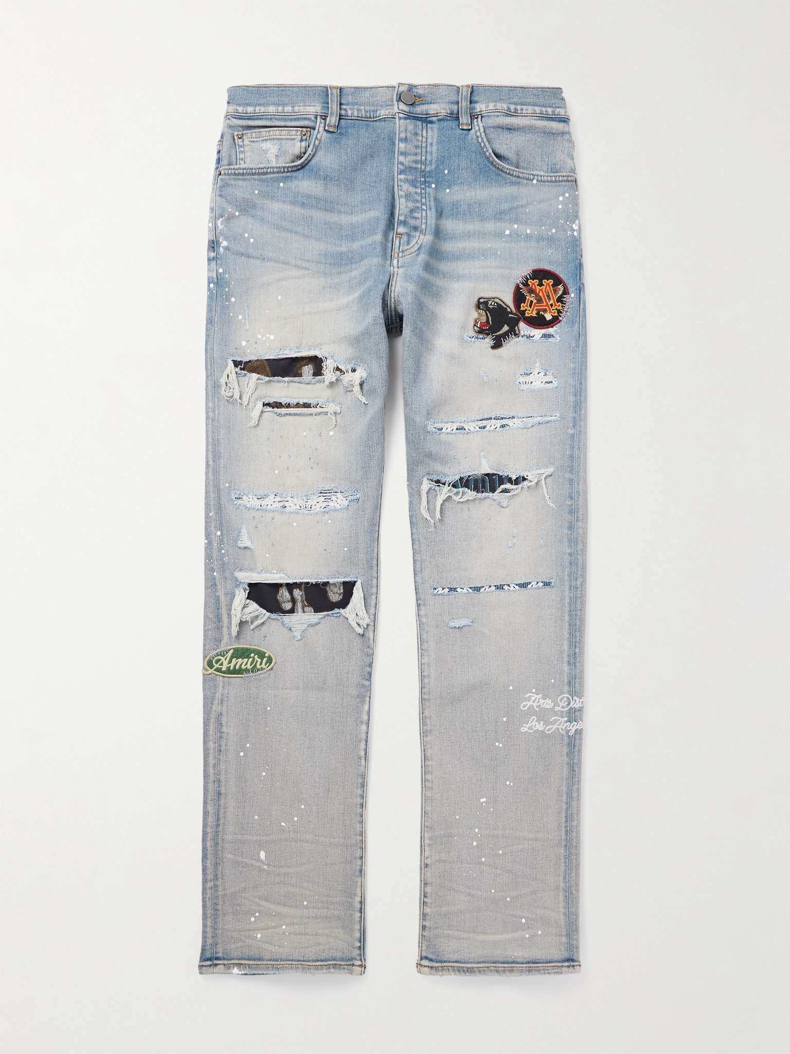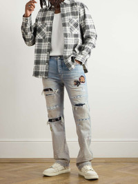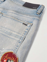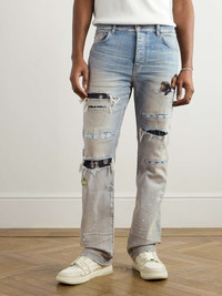AMIRI reworks jeans with the precision of a surgeon. In a signature skinny cut, this paint-splattered pair is appliqued with vintage-inspired patches and spliced with distressed cutouts at the knees to reveal printed underlays. Size & Fit - Fits true to size. Take your normal size - Those with muscular legs may wish to take the next size up - Skinny leg, mid-rise style - Mid-weight, slightly stretchy fabric - Model is shown wearing a 32 - Model measures: waist size 32, height 6'0"/ 183cm Details & Care - Light-blue and white denim - Button fastenings - 100% cotton - Dry clean - Designer wash: Antique Indigo