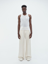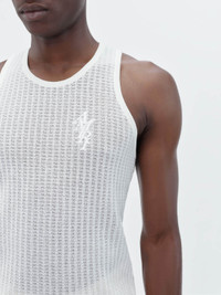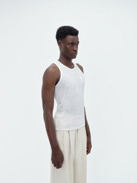 CRAFTED FROM LIGHT LINEN IN A TEXTURED WAFFLE WEAVE, THIS TANK IS EMBROIDERED WITH THE HOUSE STACK LOGO AT CHEST. A VERSATILE WARDROBE CORNERSTONE, THIS TANK LAYERS EASILY UNDER HOUSE JACKETS AND KNITWEAR. SPRING-SUMMER 2024 COLLECTION MADE IN ITALY 83% LINEN, 17% POLYAMIDE DRY CLEAN