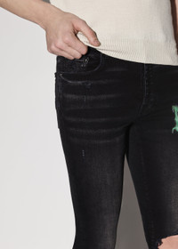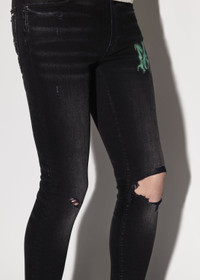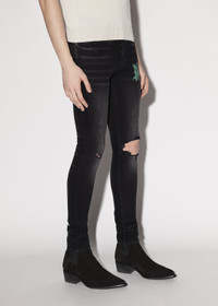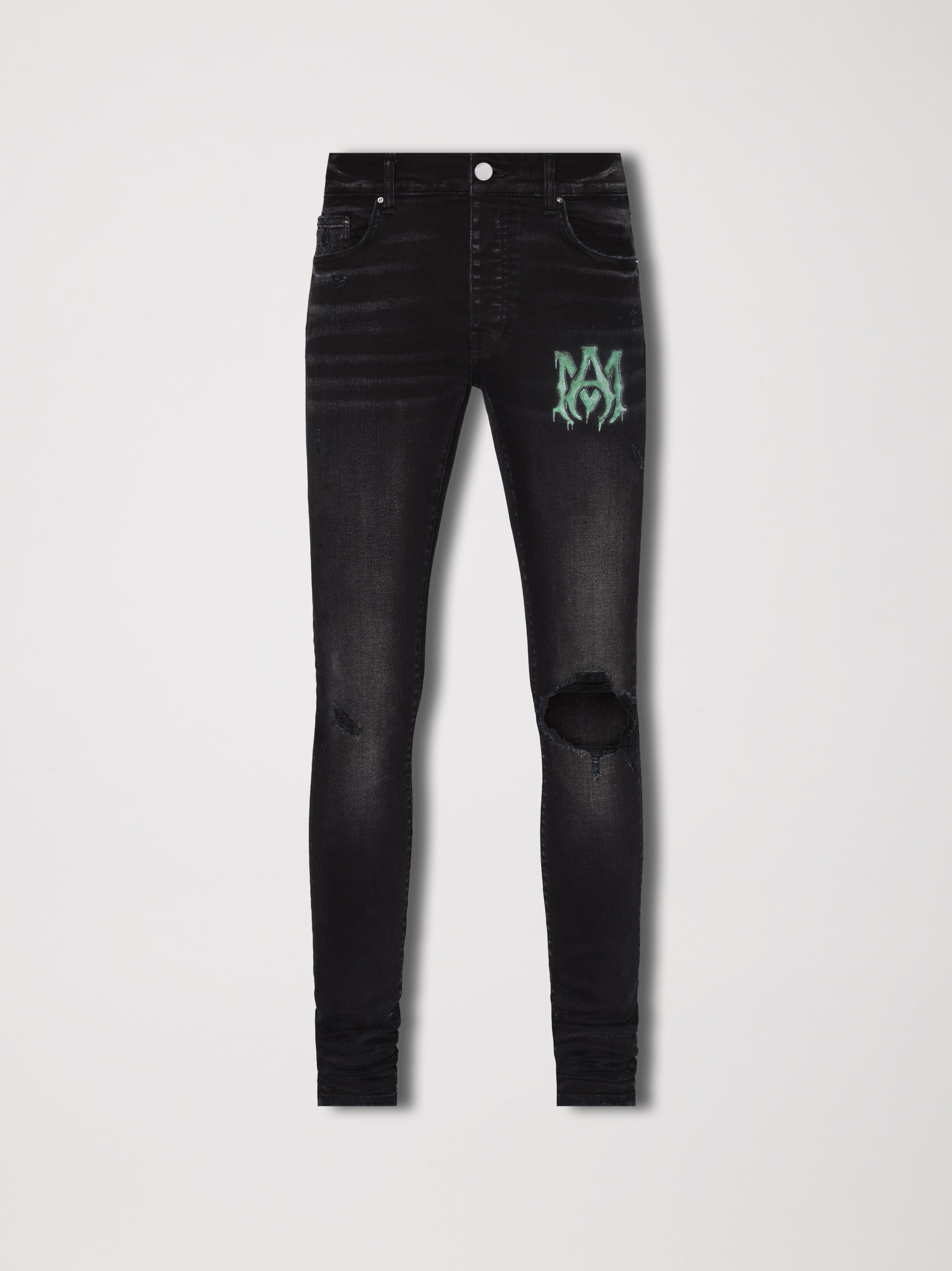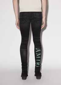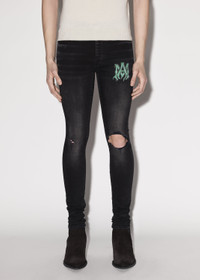 ITALIAN STRETCH DENIM CUSTOM WATERCOLOR LOGO DISTRESSED AT THE KNEE CLASSIC AMIRI 5 POCKET JEAN MADE IN LOS ANGELES, CA CLASSIC SKINNY LEG FIT MODEL IS 6'2" AND WEARS A SIZE 29 WE RECOMMEND SIZING UP FOR A LOOSER FIT DETAILS & CARE BUTTON FLY 92% COTTON 6% ELASTOMULTIESTER 2% ELASTANE SPOT CLEAN ONLY