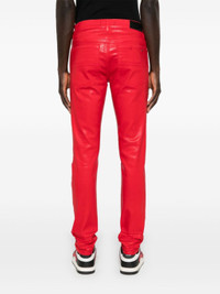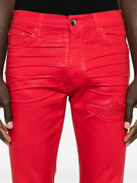 brick red cotton blend denim coated finish distressed finish ripped detailing to the leg silver-tone logo plaque low-rise belt loops button fly fastening classic five pockets tapered leg skinny cut Size & Fit Model Measurements: Bust: 0cm Height: 0cm Hips: 0cm Waist: 0cm