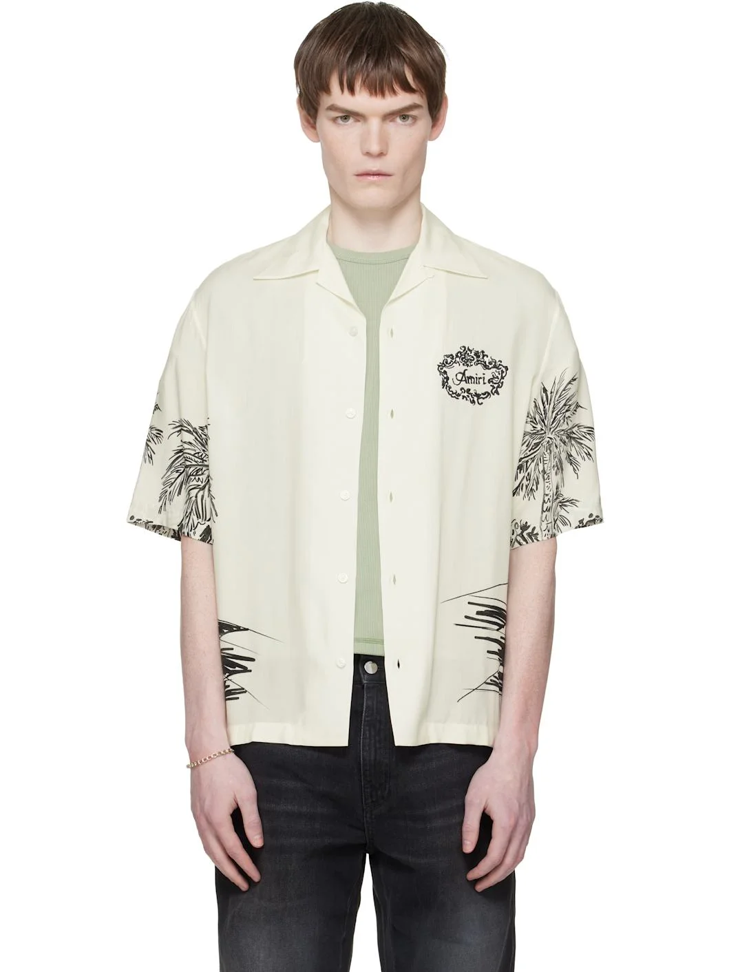 Silk satin shirt. · Graphic printed throughout · Open spread collar · Button closure · Logo graphic printed at chest Supplier color: Ivory 100% silk. Made in Italy 261886M192049