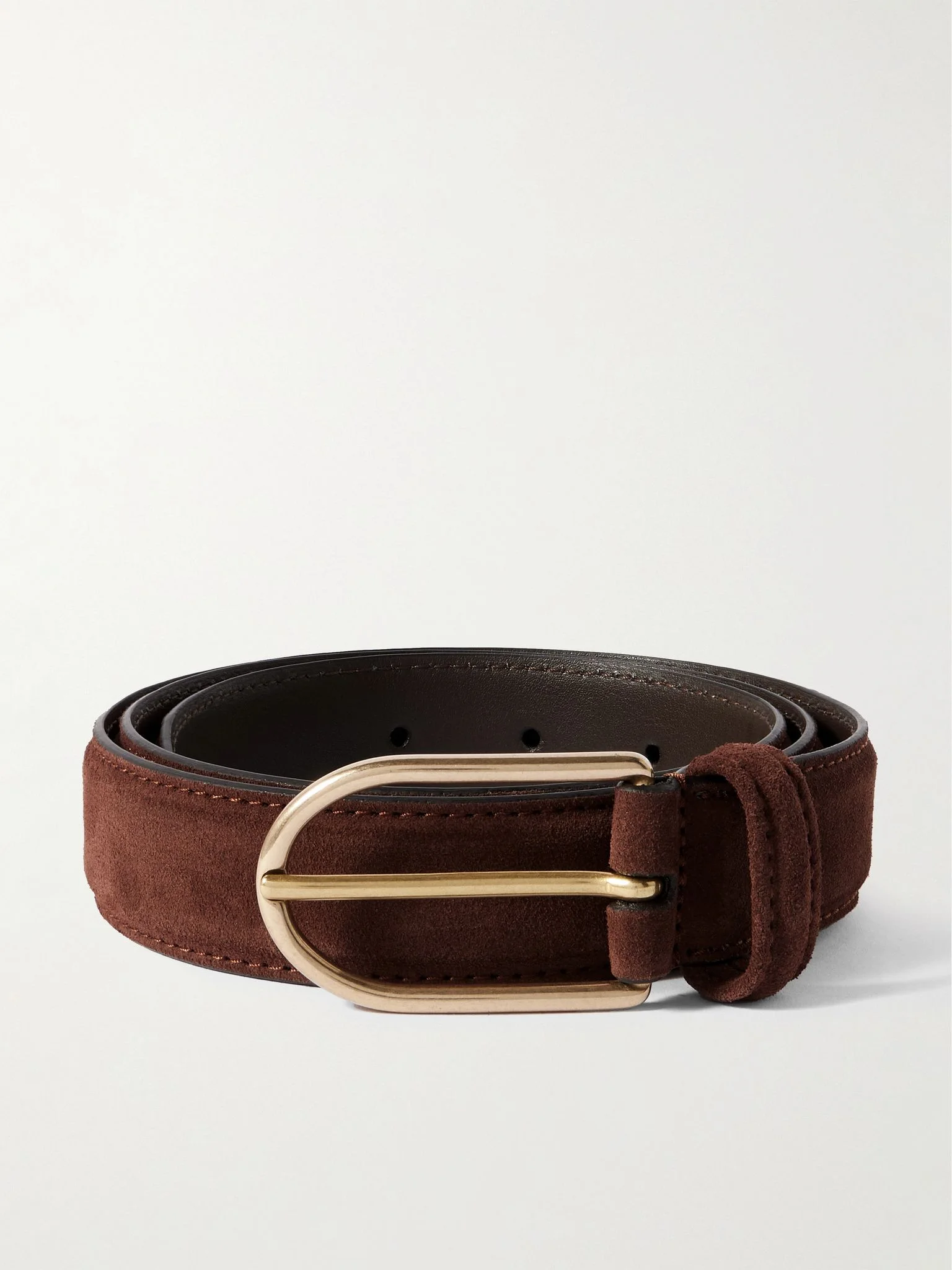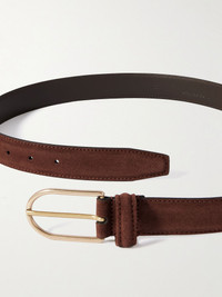 Anderson's has been making belts in Italy for more than 50 years. Designed to be worn with tailored trousers, this one is made from premium suede and fastens with an elongated, matte gold-tone buckle. The more you wear it, the more supple it'll become. Lower Impact Materials. This product is made using at least 50% lower-impact materials or ingredients. Find out more about our Consciously Crafted criteria here. Size & Fit - Fits true to size. Take your normal size - Model is shown wearing a 90 - Model measures: waist size 32 Details & Care - Dark-brown suede (Calf) - Gold-tone buckle fastening - By purchasing this product, you are supporting responsible leather manufacturing through Leather Working Group.
