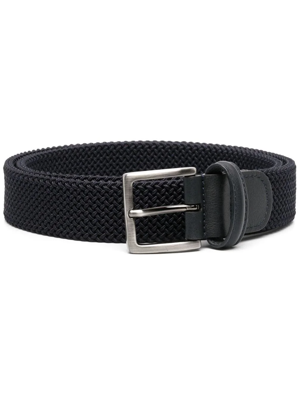 elastic woven belt Anderson's is known for its signature accessories. For AW23, a classic belt is elevated to this interwoven design. In addition, a silver-tone buckle fastening lends it a refined finish. Highlights - Navy blue - Interwoven design - Stretch-design - Buckle fastening - Adjustable fit Made in Italy Composition Nylon 95%, Calf Leather 5% SIZE & FIT Measurement Maximum Length 39.37 in(100 cm) WIDTH 1.29 in(3.3 cm) Washing instructions Specialist Cleaning