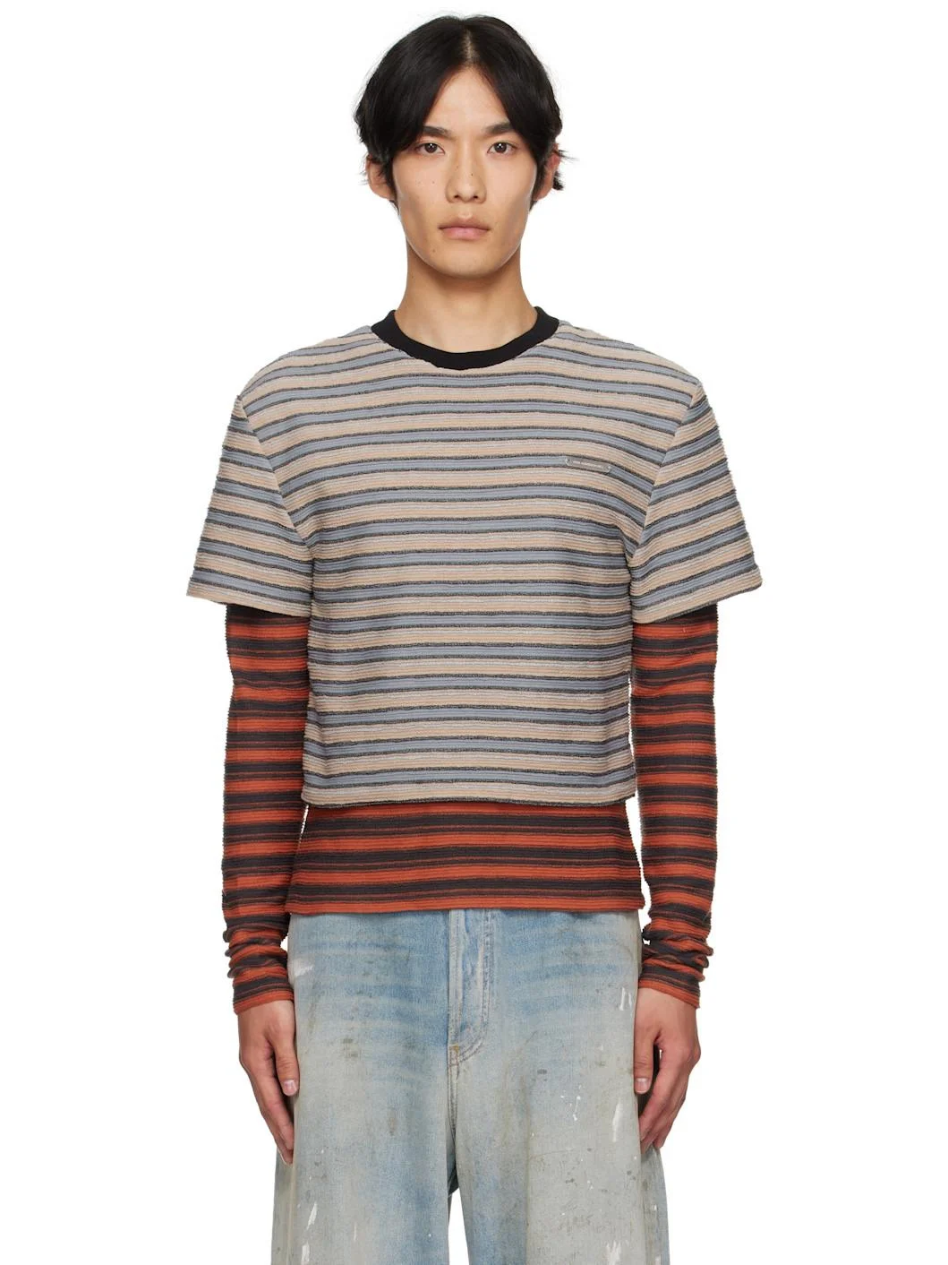 Rib-knit cotton-blend T-shirt. · Stripes throughout · Crewneck · Logo plaque at chest · Layered sleeves and hem Supplier color: Beige/Brick 60% polyester, 40% cotton. Made in South Korea 252375M213000