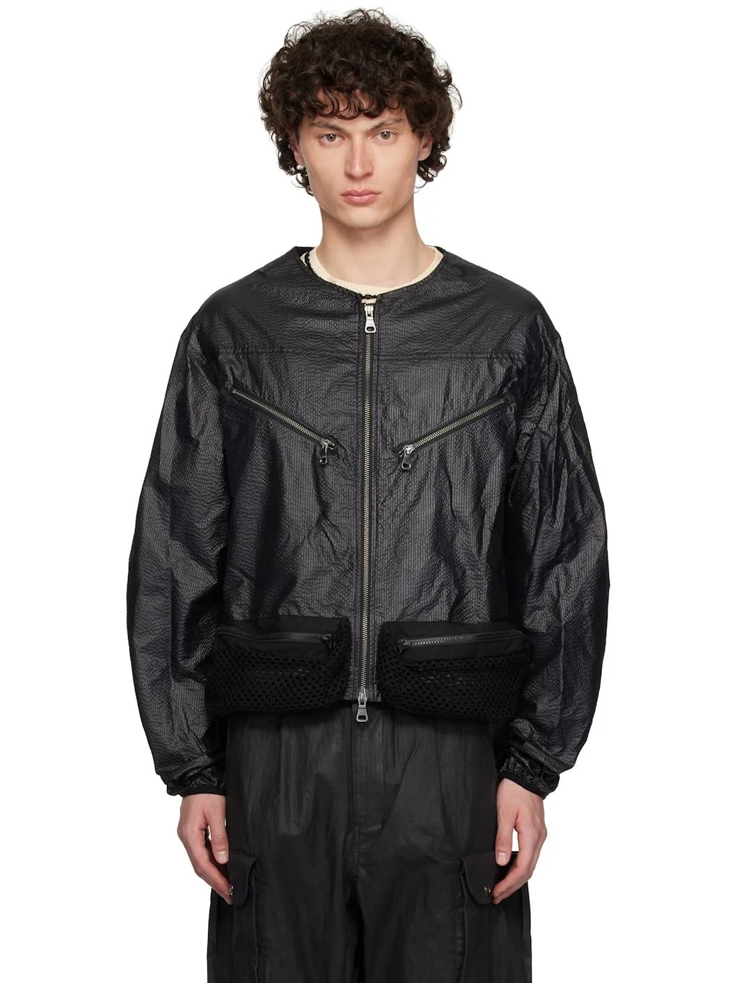 Textured nylon taffeta bomber jacket. · Round neck · Two-way zip closure · Zip pockets · Cropped hem · Lace-up fastening at side seams · Pleats at elbows · Elasticized cuffs · Logo-engraved rivets at back collar · Patch pocket at back hem Supplier color: Black Body: 100% nylon. Trim 1: 68% polyester, 32% cotton. Trim 2: 100% cotton. Made in South Korea 251375M175001