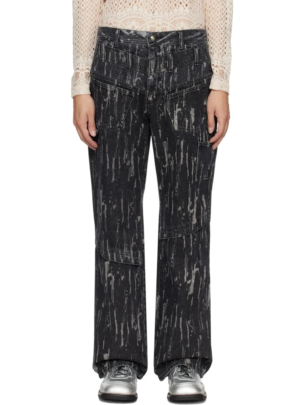 Wide-leg non-stretch denim jeans. Fading and graphic pattern printed throughout. · Layered and paneled construction · Tiered belt loops · Four-pocket styling · Zip-fly · Hammer loop and patch pockets at front · Leather logo patch at back waistband · Logo-engraved gunmetal-tone hardware Supplier color: Black 100% cotton. Made in South Korea 241375M186013