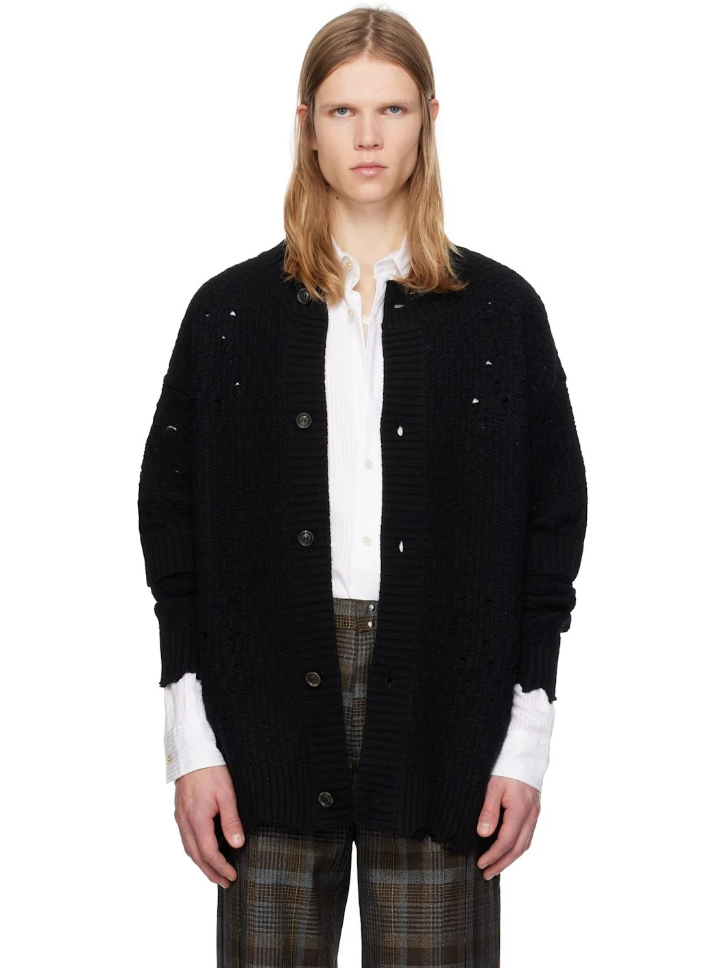 Oversized knit wool-blend cardigan. Distressing throughout. · Rib-knit crewneck, hem, and cuffs · Button closure · Rib-knit trim at placket and sleeves · Dropped shoulders · Logo-engraved horn hardware Supplier color: Black 60% wool, 35% nylon, 5% cashmere. Made in South Korea 242375M200002