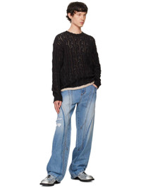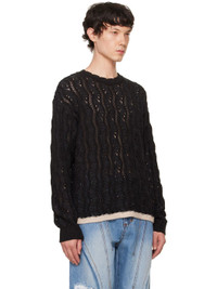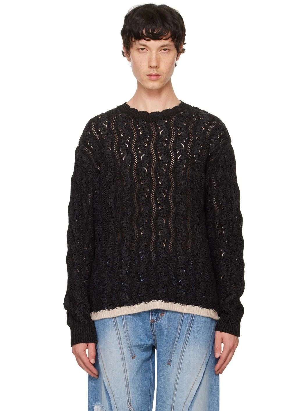 Undulating textured open knit cotton sweater. · Scalloped edge at rib knit crewneck · Rib knit hem and cuffs Supplier color: Black Body: 100% cotton. Trim: 60% wool, 35% nylon, 5% cashmere. Made in South Korea 242375M201016