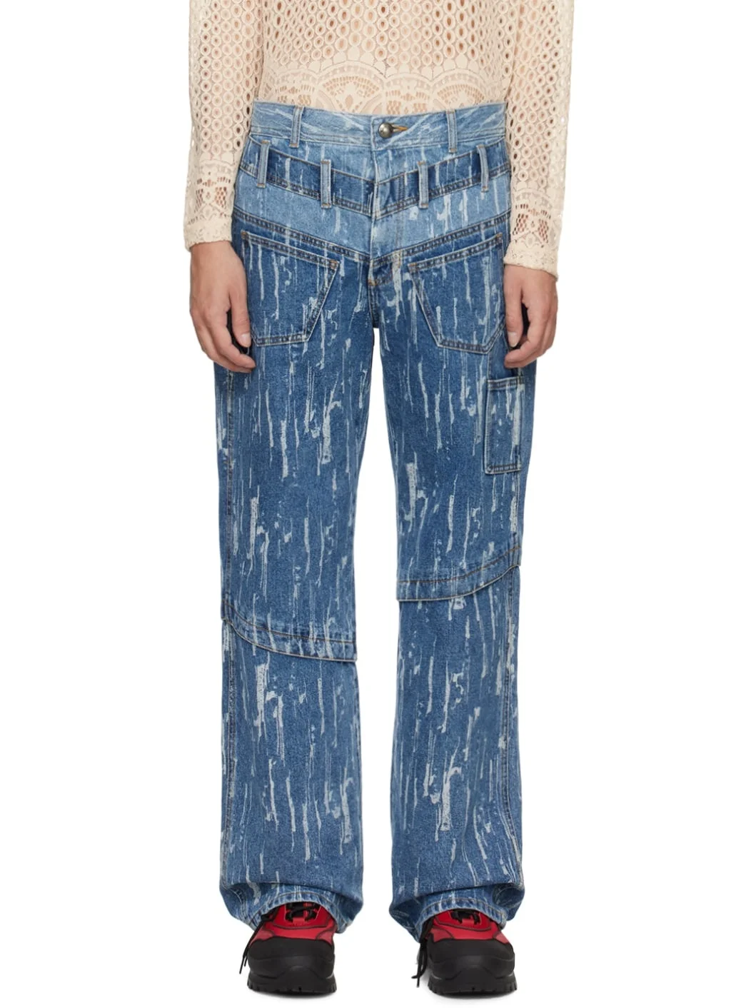 Wide-leg non-stretch denim jeans. Fading and graphic pattern printed throughout. · Layered and paneled construction · Tiered belt loops · Four-pocket styling · Zip-fly · Hammer loop and patch pockets at front · Leather logo patch at back waistband · Logo-engraved gunmetal-tone hardware · Contrast stitching in yellow Supplier color: Blue 100% cotton. Made in South Korea 241375M186012