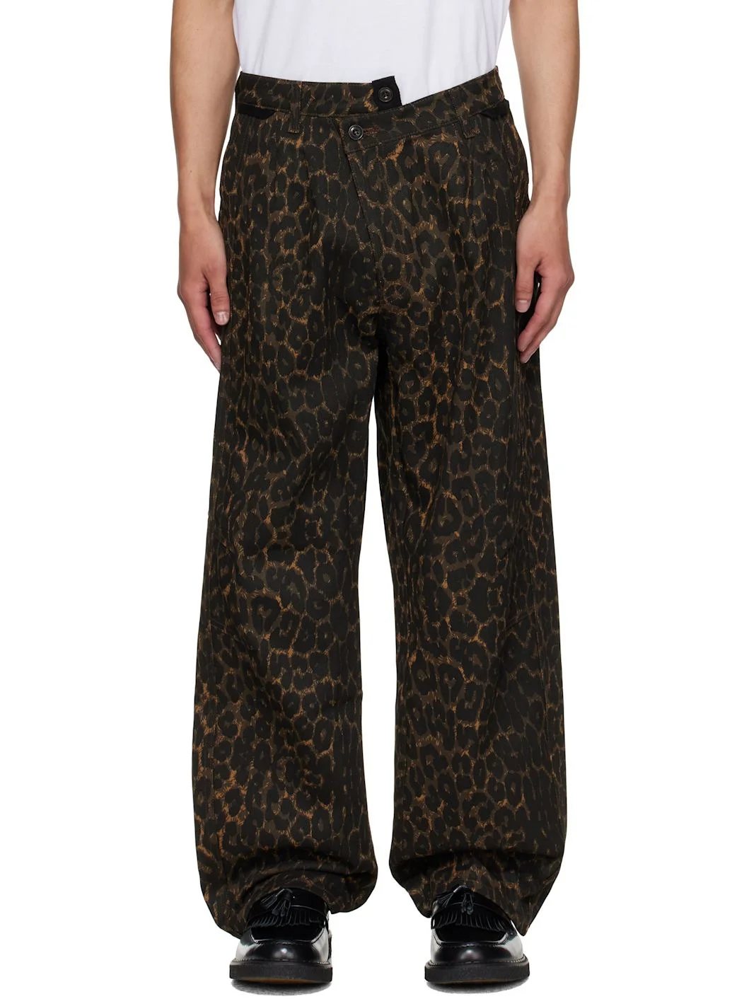 Coated non-stretch denim jeans. · Leopard pattern printed throughout · Belt loops at asymmetrical waistband · Five-pocket styling · Modified button fly · Darts at knees · Cinch tabs at back waistband · Webbing loops at waistband Supplier color: Green khaki 63% cotton, 36% cellulose, 1% polyester. Made in South Korea 252375M186004